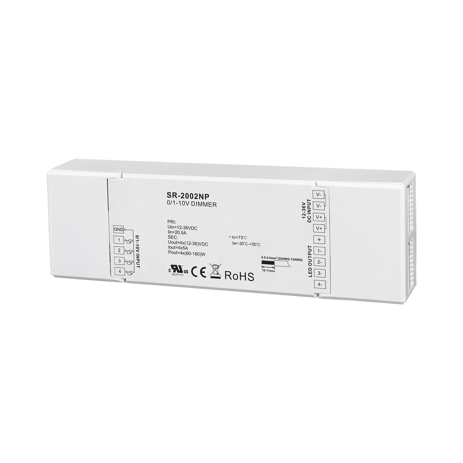 The 0/1-10V LED Dimmer is an analog dimming driver with 4 channels of 0/1-10V signal input and 4 channels of PWM output. It accepts a standard 0/1-10V dim signal input and offers a 0-100% dimming range through a logarithmic characteristic, providing optimal visual comfort.