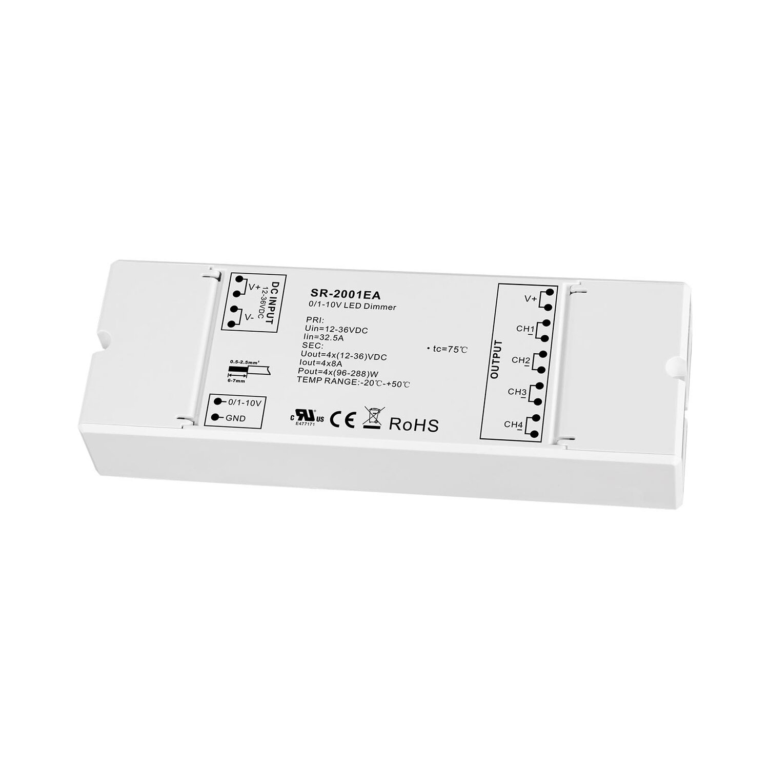 Der SR-2001EA ist ein Konstantspannungs-Dimmer für 0/1-10V-LEDs mit 4 Kanälen, maximal 8A pro Kanal und erhältlich mit 12VDC-, 24VDC- und 36VDC-Ausgang, der ein Standard-1-10V-Dimmsignal empfängt und ein PWM-Signal ausgibt. Der 1-10V-Dimmer ist mit einem 1-Kanal-1-10V-Eingang und einem 4-Kanal-PWM-Ausgang ausgestattet.