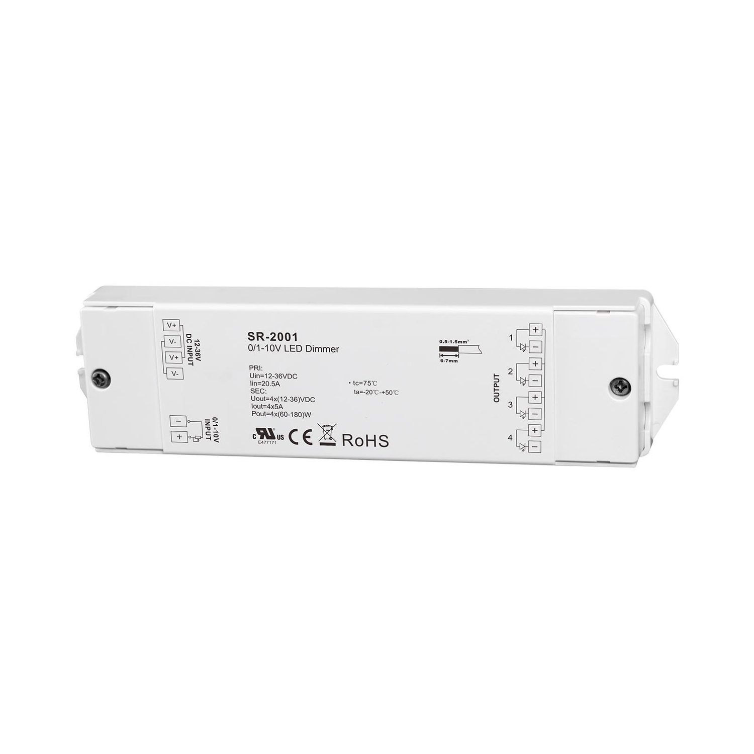 The SR-2001 is a constant voltage 0/1-10V LED dimmer with 4 channel, maximum 5A per channel output and available in 12VDC, 24VDC and 36VDC output, which receives standard 1-10V dimming signal and outputs PWM signal. The 1-10V dimmer is designed with 1 channel 1-10V input and 4 channel PWM output.