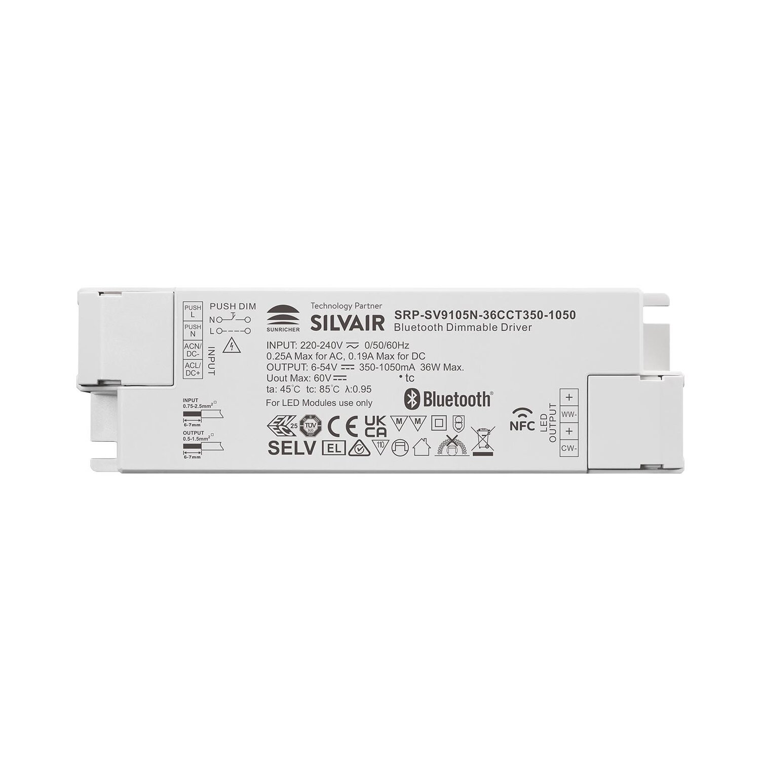 SRP-SV9105N-36CCT350-1050 ist ein programmierbarer LED-Treiber mit 36 W Bluetooth NFC in einem Kunststoffgehäuse, der mit Silvair-Technologie ausgestattet ist. Er verfügt über 2 Kanäle mit Konstantstromausgang und einem einstellbaren Strom von 350 mA bis 1050 mA, wodurch er für LED-Leuchten mit unterschiedlichem Strom geeignet ist. Er ist für eine Eingangsspannung von 220–240 VAC ausgelegt. Der Leistungsfaktor des Treibers kann über 0,95 liegen und der Wirkungsgrad ist höher als 75%. Er ermöglicht eine gleichmäßige und tiefe Dimmung auf 0,01% ohne Flackern und Brummgeräusche.