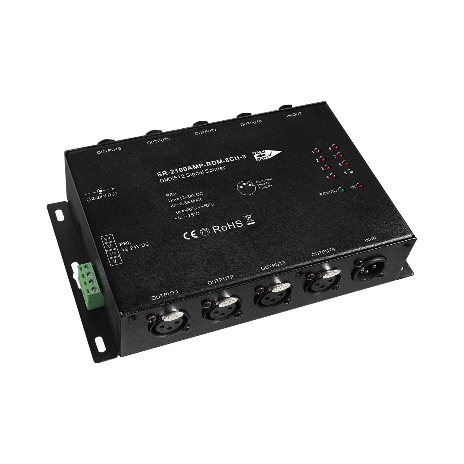 The 8-Way RDM Enabled DMX Splitter is a DMX/RDM compatible device that is RDM enabled and ANSI E1.20 compliant. It extends both cable distance (up to 300m) and the number of devices (up to 32 devices per output, for a total of 256 devices). This plug-and-play splitter features a 3/5-pin XLR male DMX input and eight XLR female DMX outputs, with each output fully isolated from the input, though outputs are not isolated from each other. Each output includes LED data indicators for confirming proper operation, and it supports bi-directional communications for discovery, addressing, and DMX control of RDM-enabled devices. A feed-through XLR female connector is provided at the input, allowing the unit to be placed in the middle of an existing DMX chain.