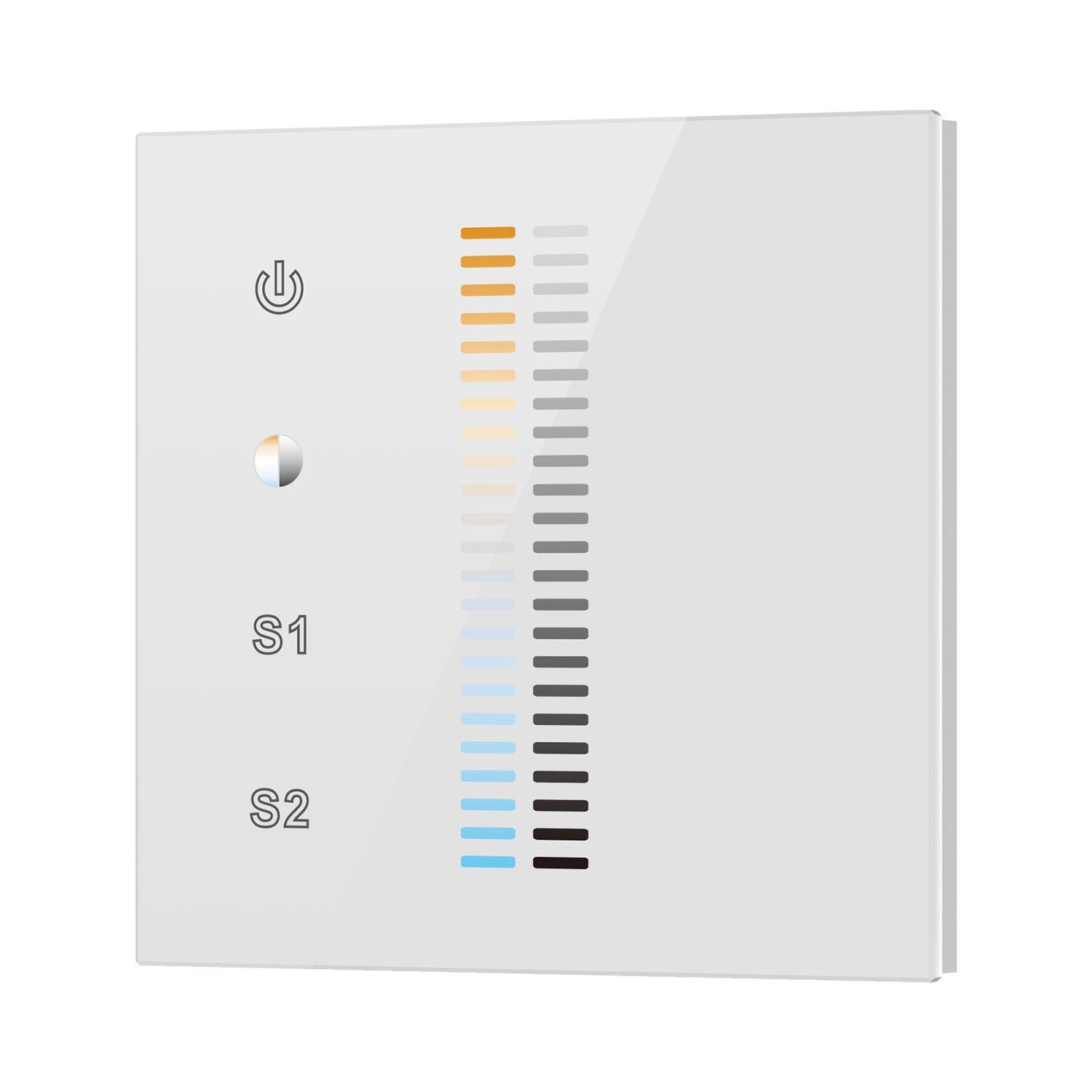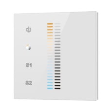 El controlador de doble color para montaje en pared 0/1-10 V cuenta con una interfaz de cristal sensible al tacto disponible en blanco y negro, diseñada para controlar la temperatura de color CCT. Ofrece cuatro canales con salida de señal de 1-10 V y admite la selección de la versión 0-10 V.