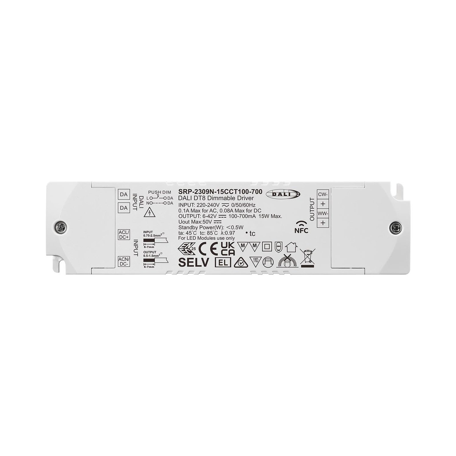 Descripción del producto. Este controlador LED DT8 DALI programable NFC de 15 W cuenta con la certificación DALI-2 y cumple con las normas IEC 62386-101:2014, IEC 62386-102:2014 e IEC 62386-207 Ed2, además de ser compatible con maestros DALI universales que admiten comandos DT8. El controlador se puede programar. Con la aplicación o herramienta de programación NFC, la corriente de salida se puede configurar con pasos de 0,1 mA entre 100 y 700 mA, lo que garantiza una alta precisión de la corriente y ayuda a reducir las existencias. Las configuraciones DALI, como el direccionamiento, la agrupación, la configuración de escenas, el nivel de encendido, el nivel de fallo del sistema, el tiempo de atenuación, la velocidad de atenuación, etc., también se pueden configurar a través de NFC. Con la interfaz DALI-2/Push incorporada, este dispositivo DALI DT8 está dotado de un alto factor de potencia y eficiencia. Este controlador regulable tiene una potencia de salida máxima de 15 W. Con una fuente de alimentación de clase II y una carcasa de plástico totalmente aislada, este controlador puede conmutar y regular la intensidad de las luminarias LED. Ofrece una regulación profunda y sin parpadeos hasta 0,011 TP3T. Además, cuenta con una función de informe de errores. Su grado de protección es IP20, lo que lo hace adecuado para aplicaciones de iluminación LED en interiores, con 5 años de garantía.