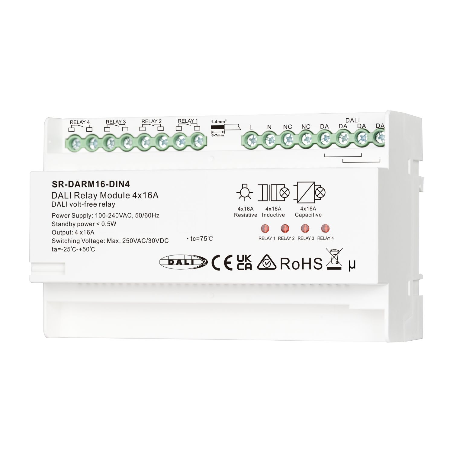 El relé DALI de 4 canales para carril DIN es un módulo de relé con certificación DALI-2 diseñado para su instalación en carril DIN con una entrada de alimentación de 100-240 VCA, que permite controlar cuatro contactores estándar a través de DALI para integrar cargas no DALI en circuitos DALI; cuenta con detección de paso por cero para mejorar la vida útil del relé y es compatible con sistemas DALI universales y carriles DIN estándar de 35 mm.