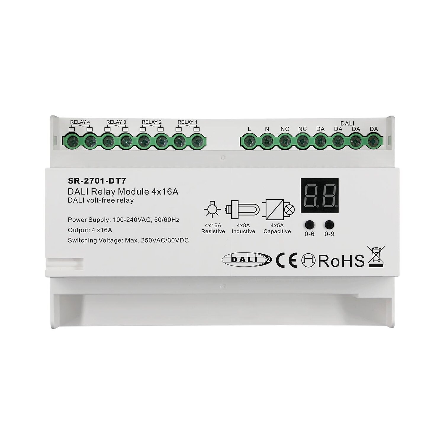 El relé DALI de 4 canales para carril DIN es un módulo de relé con certificación DALI-2 diseñado para su instalación en carril DIN con una fuente de alimentación de 100-240 VCA, que cuenta con cuatro canales de relé que se pueden controlar de forma individual o simultánea configurando manualmente de 1 a 4 direcciones DALI a través de una pantalla digital, lo que permite el control de contactores estándar y la integración de cargas sin entrada DALI en el circuito DALI para la conmutación de encendido/apagado. Es compatible con sistemas DALI universales y controladores maestros, y se adapta a carriles DIN estándar de 35 mm.