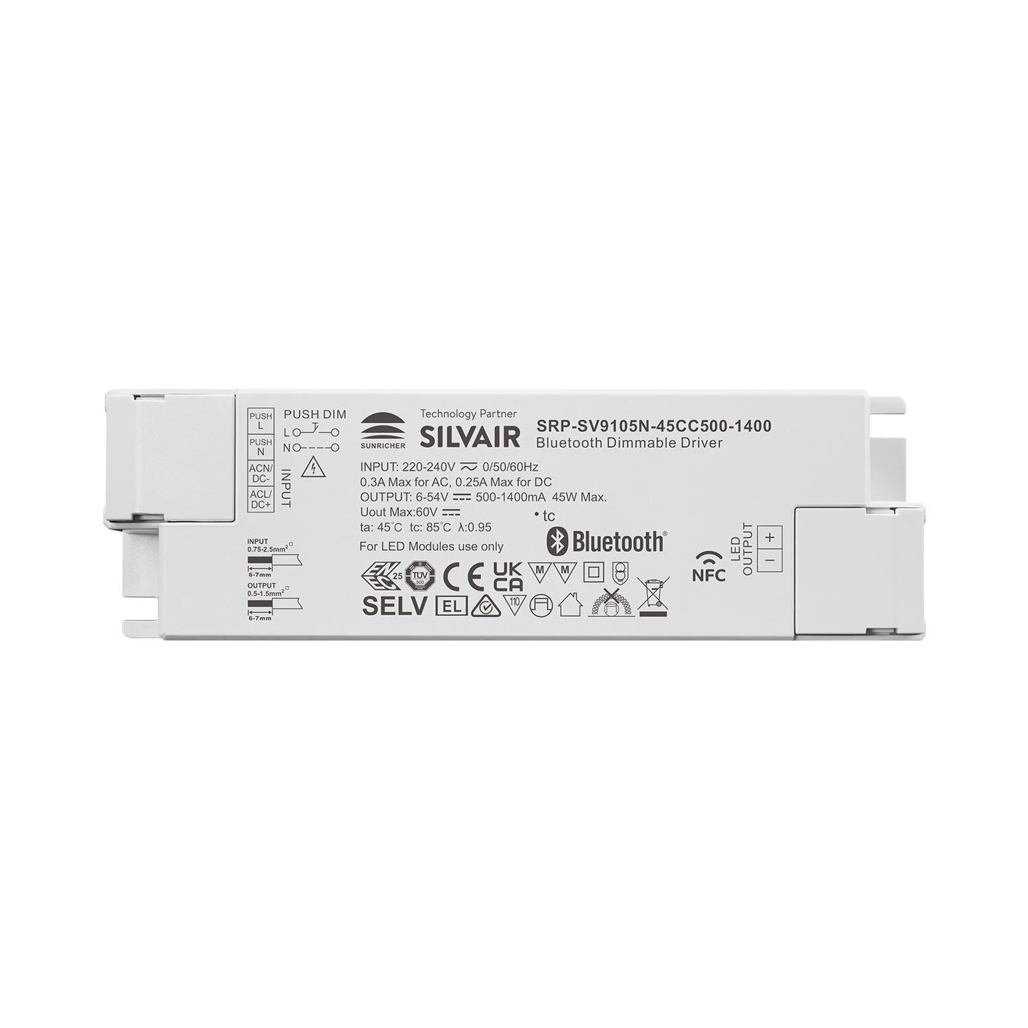 El SRP-SV9105N-45CC500-1400 es un controlador LED programable Bluetooth NFC de 45 W con carcasa de plástico, habilitado por la tecnología Silvair. Está diseñado con una salida de corriente constante de 1 canal con corriente ajustable de 500 mA a 1400 mA, lo que lo hace adecuado para luces LED con diferentes corrientes. Está diseñado con una entrada de 220-240 VCA. El factor de potencia del controlador puede superar 0,95 y la eficiencia es superior a 75%. Permite una atenuación suave y profunda hasta 0,01% sin parpadeos ni zumbidos.