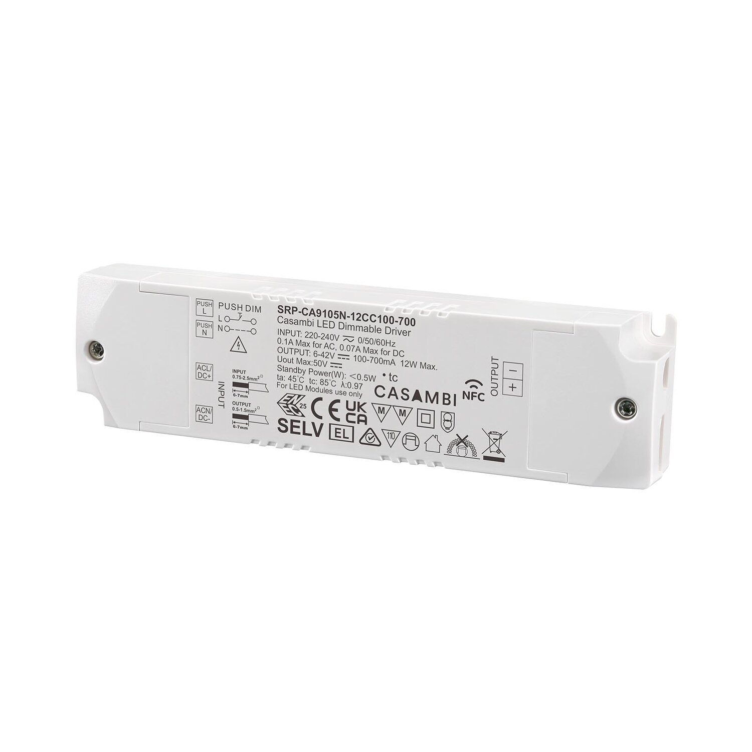 SRP-CA9105N-12CC100-700 es un controlador LED programable Bluetooth NFC de 12W con carcasa de plástico, habilitado por la tecnología Casambi. Está diseñado con 1 canal de salida de corriente constante con corriente ajustable de 100mA a 700mA, lo que le permite ser adecuado para luces LED con diferentes corrientes. Está diseñado con 220-240VAC de entrada con alto factor de potencia y eficiencia. Permite una atenuación suave y profunda hasta 0,01% sin parpadeos ni zumbidos.