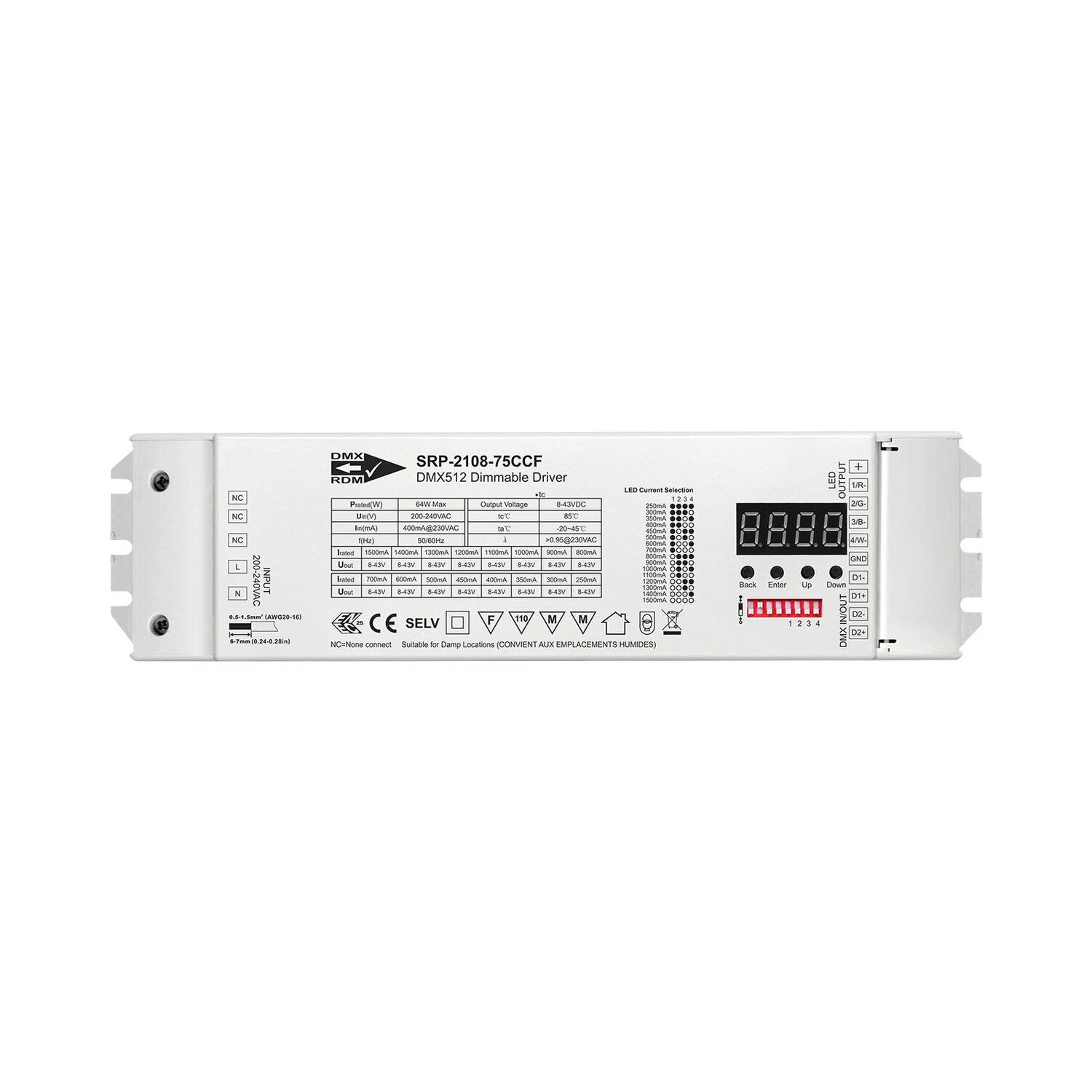 SRP-2108-75CCF es un controlador LED de corriente constante regulable DMX de 75 W aprobado por ENEC con 4 canales de salida de 250 mA-1500 mA que se pueden ajustar mediante interruptores DIP y entrada de 200-240 VCA. El factor de potencia del controlador puede ser superior a 0,9 y la eficiencia es superior a 87%.