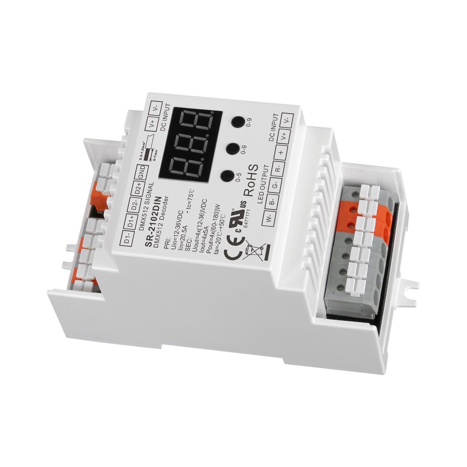 DMX address can be set freely and shown on the numeric digital display. The din rail mounted DMX512 decoders can be compatible with our DMX masters such as SR-2811DMX, SR-2201DMX, SR-2812, SR-2816 and others.