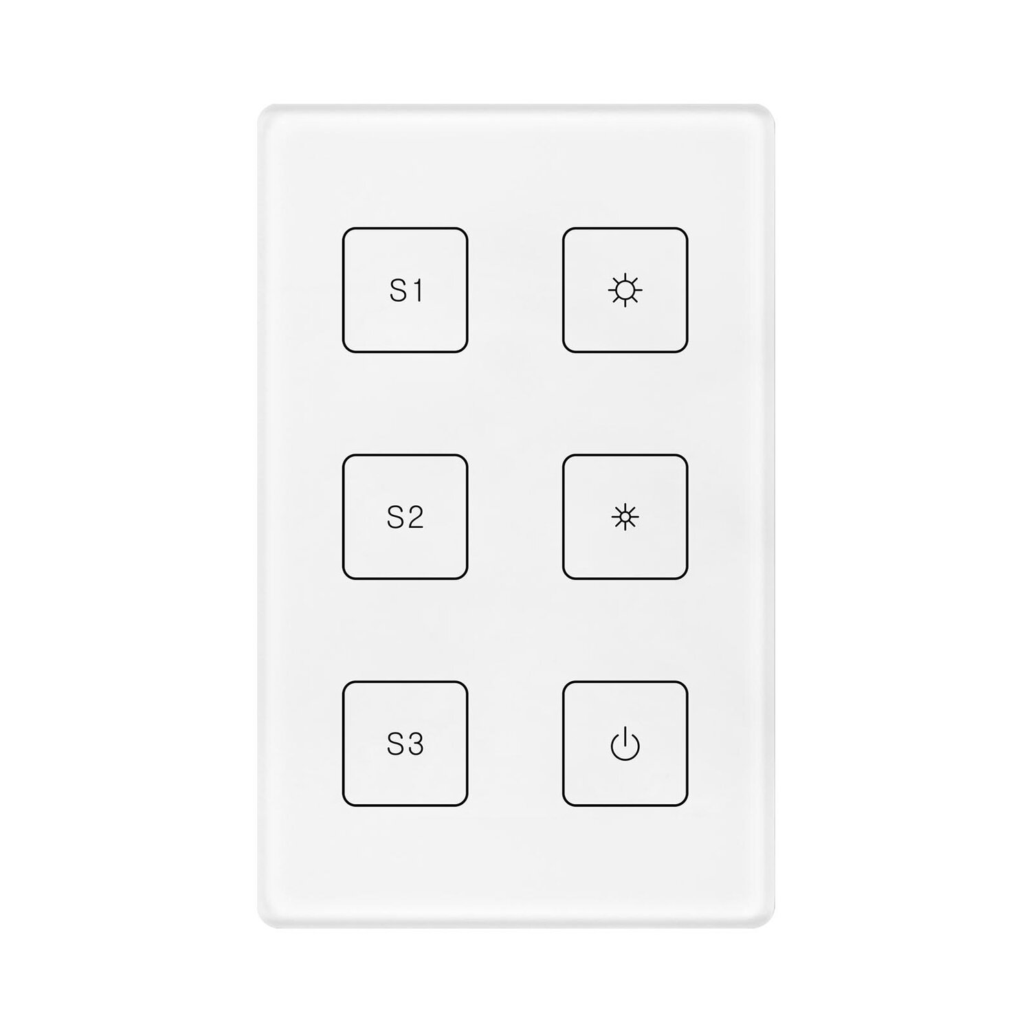 Este controlador de panel táctil DALI permite enviar comandos de regulación a un grupo de dispositivos del circuito DALI mediante un grupo de botones. Puede controlar el encendido y apagado de luces, la regulación y la activación de escenas.