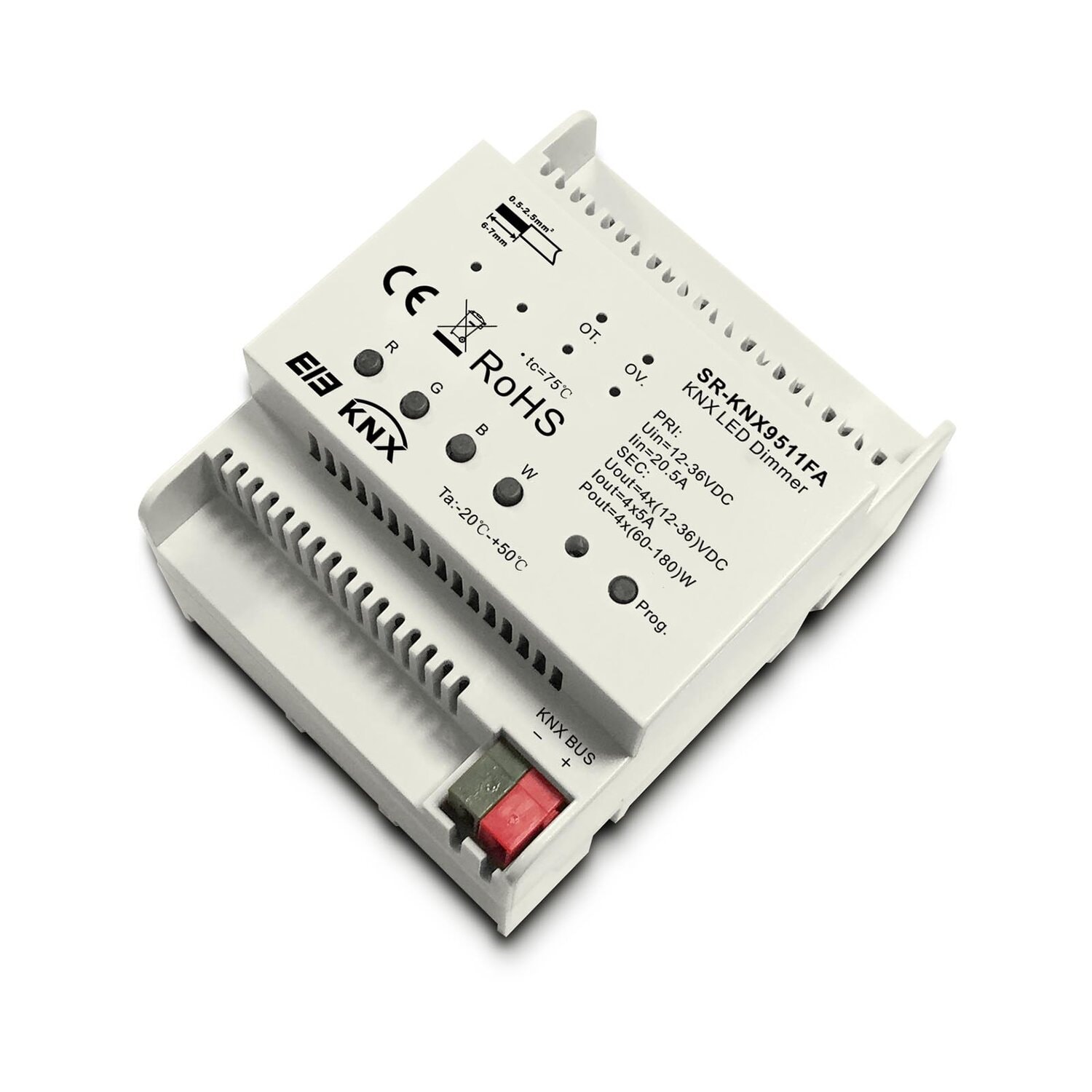The KNX controller SR-KNX9511FA is a constant voltage RGBW LED controller with 4 channel, 5A per channel output, which can be compatible with KNX system to control RGB/RGBW LED lighting and support group, scene and sequence. 0%-100% smooth dimming without any flickering can be achieved by the KNX dimmer, which is perfect for human’s vision.