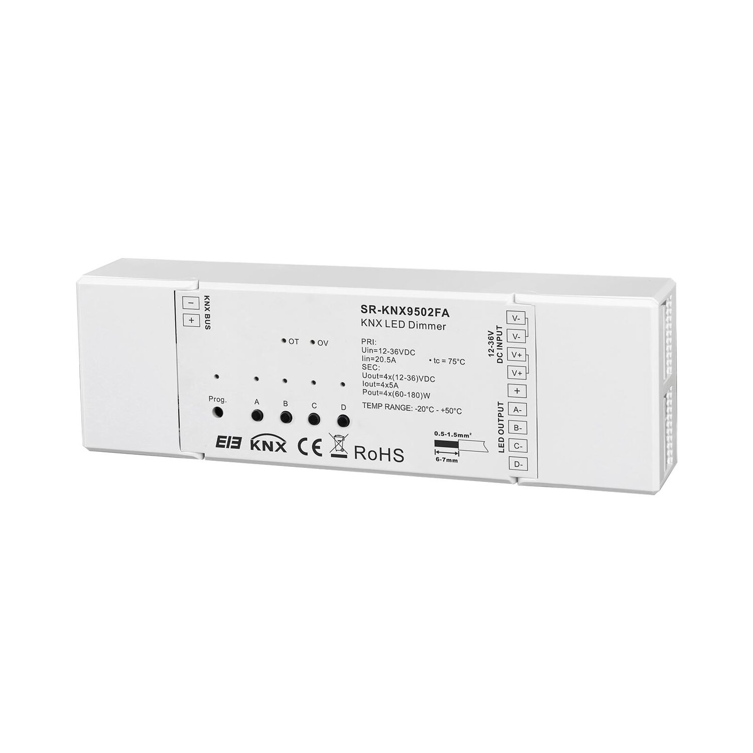The KNX Dimmer SR-KNX9502FA is an easy connection constant voltage dimming controller with 4 channel, 5A per channel output, which can be compatible with KNX system to dim and switch single color LED lighting and support group, scene and sequence. The KNX dimmer is designed with newly updated outer shell which features easy connection terminal without screw to ensure easy and fast connection.