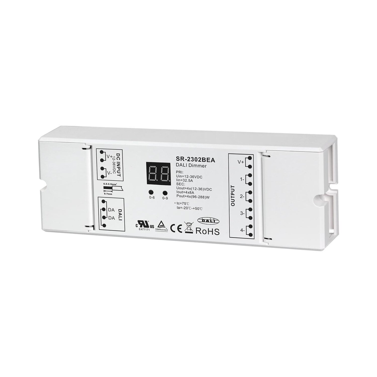 The DALI Dimmer SR-2302BEA is a constant voltage dimming controller with 4 channel, 8A per channel output, which complies to standard DALI protocol with 1 DALI address to control 4 channels synchronously. The DALI address can be manually assigned and shown on the numeric digital display or automatically assigned by master controllers.