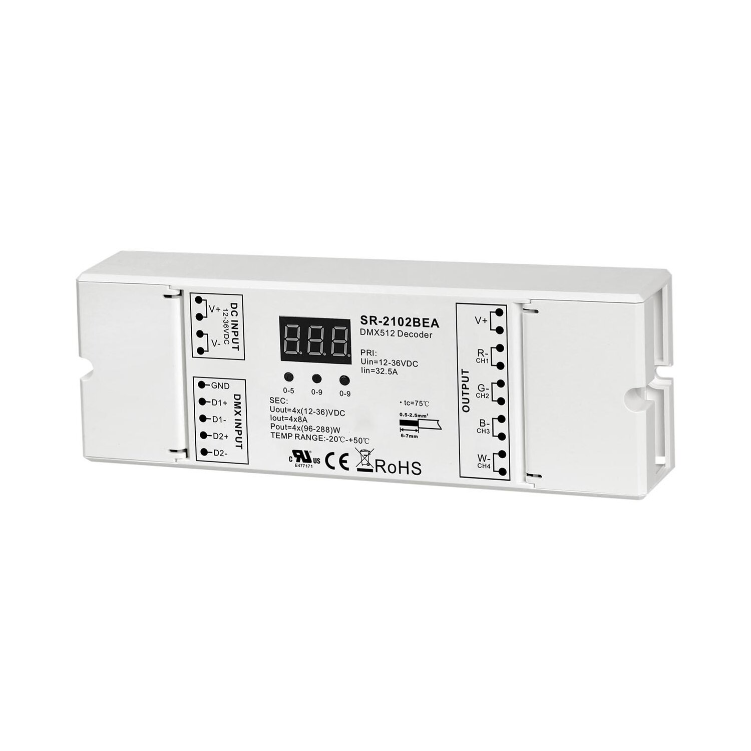 The SR-2102BEA is a constant voltage DMX512 decoder with 3 channel or 4 channel selectable, 8A per channel output and available in 12VDC, 24VDC and 36VDC output. The DMX512 decoder is designed with DMX512 compliant control interface, which enables users to set DMX address freely and shows the address on digital numeric display.