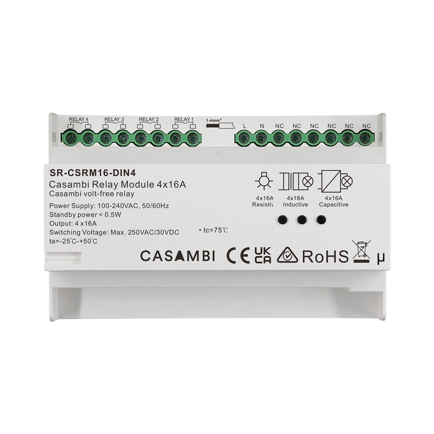 The 4 Channels DIN Rail Casambi Relay is a versatile relay module powered by a 100-240VAC supply, designed to control four standard contactors. Each of its four endpoints can be independently controlled via the Casambi app, remotes, wall switches, or kinetic switches.