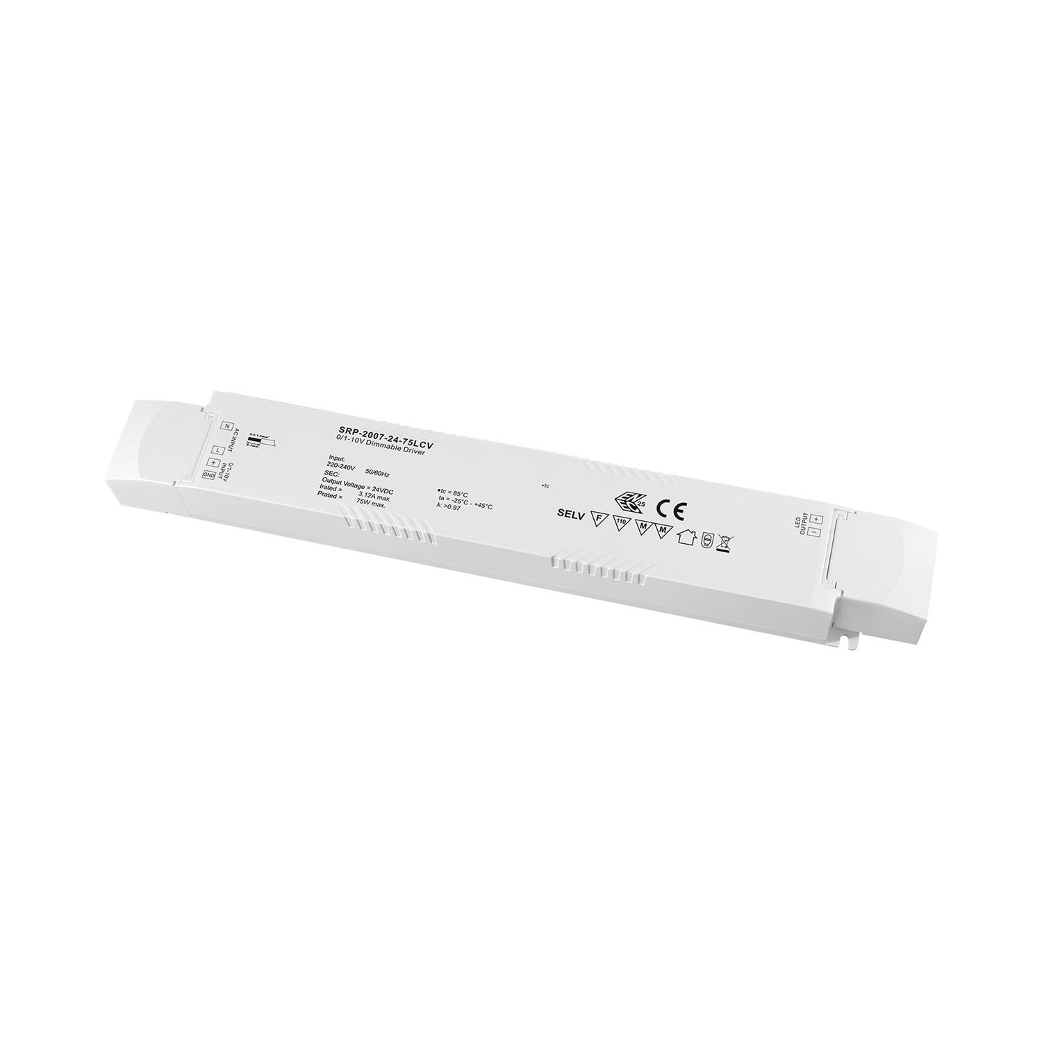 The SRP-2007-24-75LCV is an UL & ENEC approved 75w 0/1-10V LED dimmable driver with 220-240VAC input and 1 channel constant voltage output. The output voltage can be available in 24VDC by factory setting.