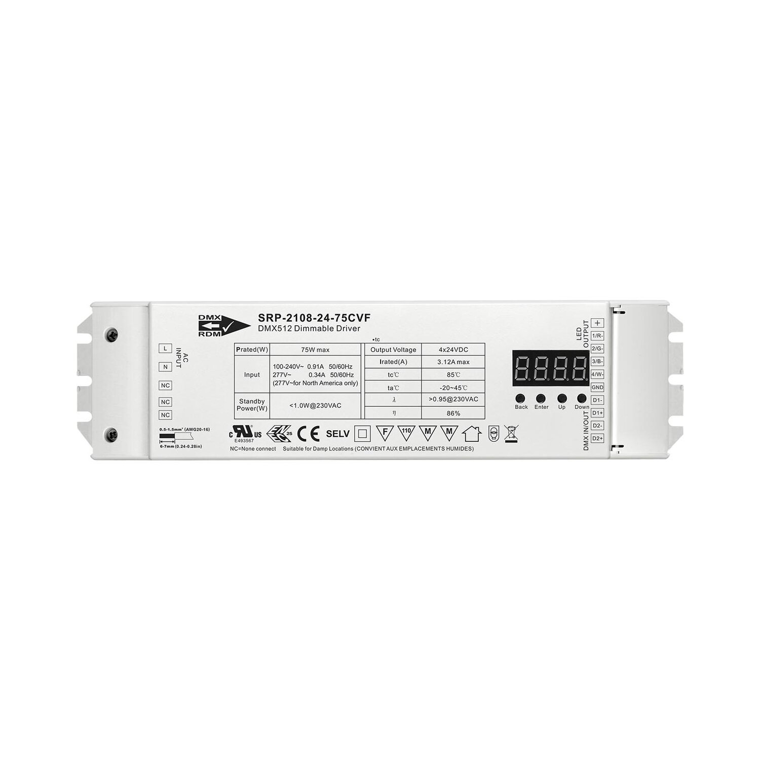 SRP-2108-24-75CVF est un driver LED 75w dimmable DMX, approuvé par UL, ENEC et TUV, avec une sortie 24VDC à tension constante et une entrée universelle 100-240VAC. Le facteur de puissance du driver peut être supérieur à 0,9 et l'efficacité est supérieure à 90%.