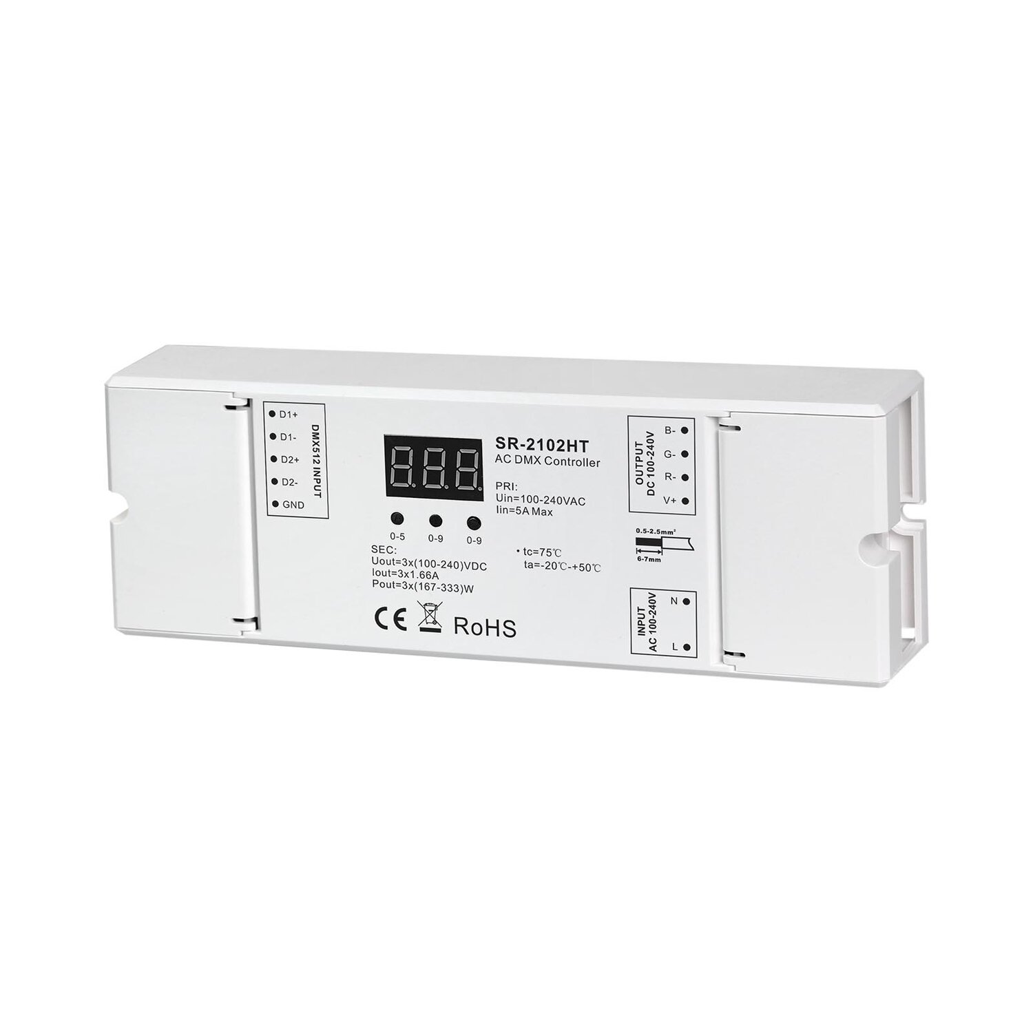 Le contrôleur DMX pour bande LED haute tension 100~240 V CC est doté d'une conception à isolation totale sûre et fiable. Il est compatible avec les bandes LED haute tension 100~240 V CC et prend en charge les types RGB et Mono.