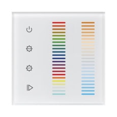 Le RF + DMX512 RGB+Dual Color Controller est doté d'une interface tactile en verre disponible en blanc et en noir, prend en charge la sortie de signaux DMX512 standard, contrôle les couleurs RVB et CCT et gère une seule zone ou un seul secteur.