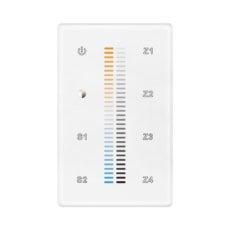 The RF Dual Color Wall Mounted Controller features a touch-sensitive glass interface in white and black. It is compatible with all universal series RF receivers and operates at a radio frequency of 916.5MHz. This controller enables control of CCT colors and can manage up to 4 zones both synchronously and separately.