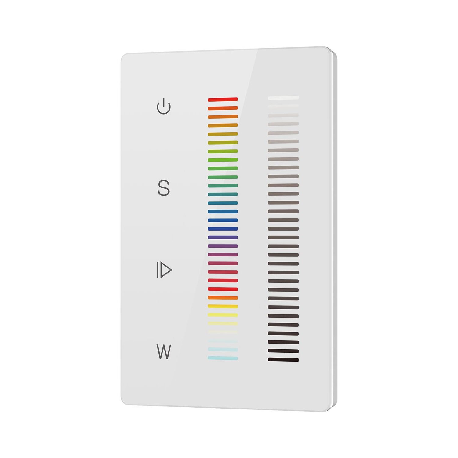 Le contrôleur mural RF RGBW est doté d'une interface tactile en verre, disponible en blanc et en noir, et fonctionne à une fréquence radio de 916,5 MHz, ce qui le rend compatible avec tous les récepteurs RF de la série universelle. Il permet un contrôle précis des couleurs RGBW et gère une zone d'un récepteur RF, offrant une solution élégante et fonctionnelle pour le contrôle de l'éclairage.