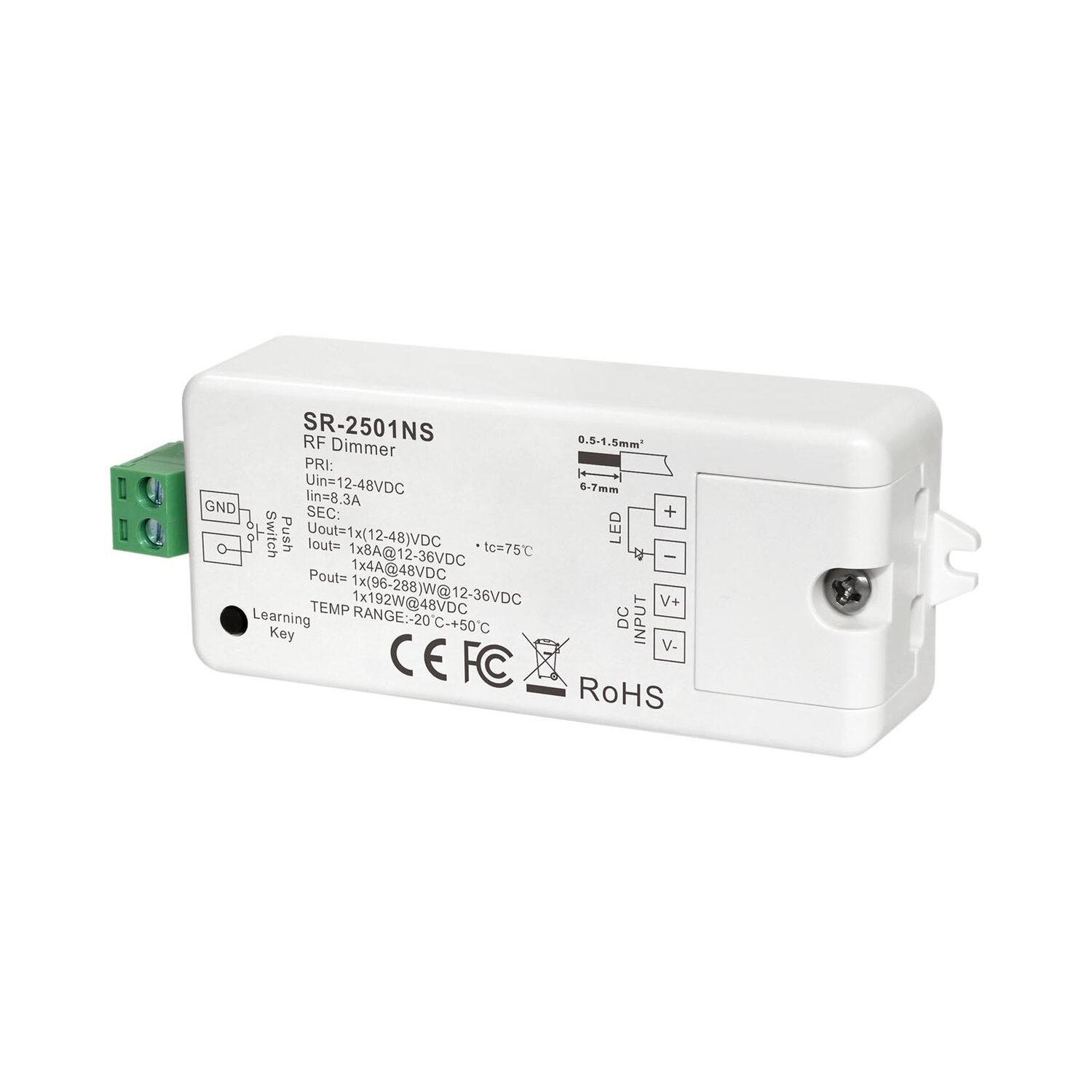 The RF receiver operates with a 12-36VDC input, featuring a DC-DC constant voltage output with push-dim functionality. It supports one channel, capable of handling up to 8A per channel, with power ratings of 12V@96W, 24V@192W, and 36V@288W. The receiver operates at frequencies of 868MHz, 434MHz, and 916MHz, ensuring compatibility across various RF communication setups.