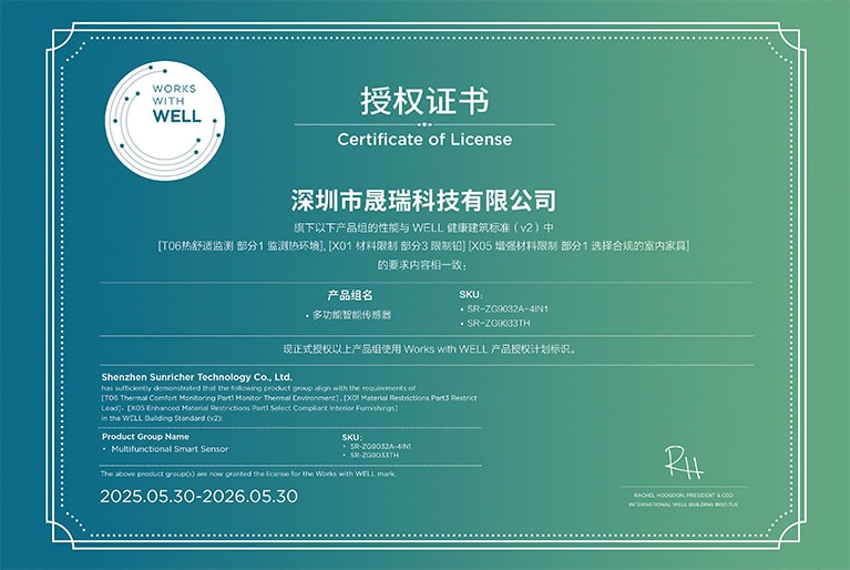 Sunricher is proud to announce that its Multifunctional Smart Sensor has earned the “Works with WELL” trademark through a licensing program by the International WELL Building Institute (IWBI). This designation confirms that the product aligns with key strategies in the WELL Building Standard (v2), having met the requirements of: