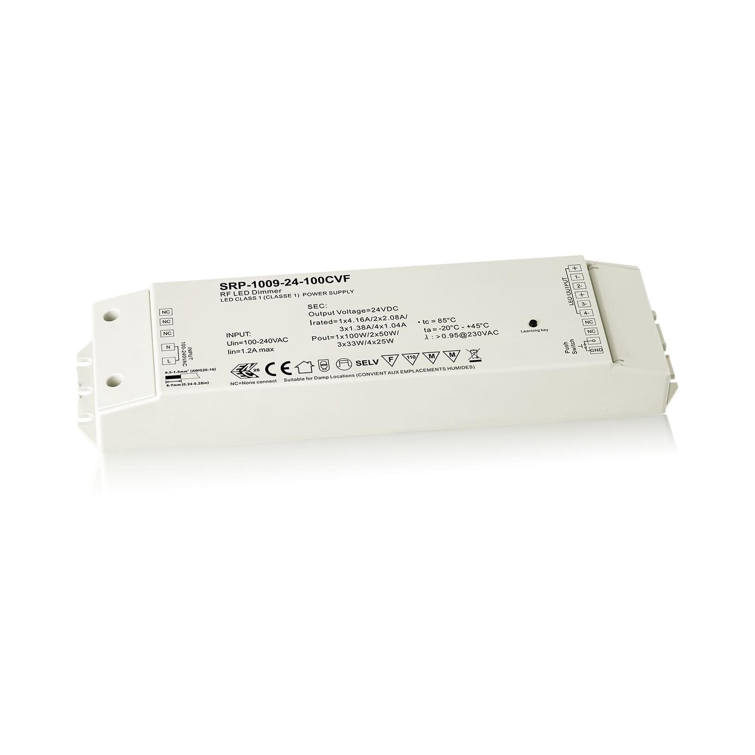 The 100W RF Dimmable LED Driver offers a maximum output power of 100W with 4 channels of 24VDC constant voltage output. It features a class 1 power supply with a fully isolated plastic case, ensuring high power factor and efficiency.