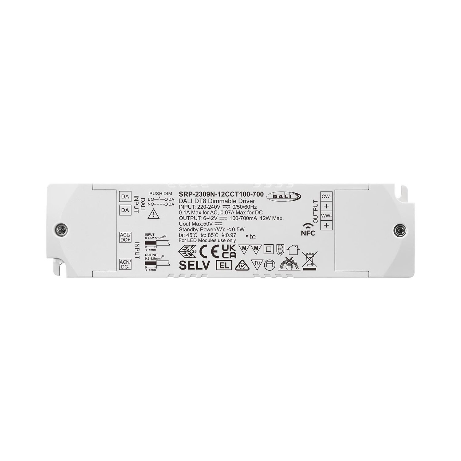 Product Description. This 12W NFC programmable DALI DT8 LED Driver is DALI-2 certified and in compliance with IEC 62386-101:2014, IEC 62386-102:2014, IEC 62386-207 Ed2, and compatible with universal DALI masters that support DT8 commands. The driver can be programmed. with NFC programming APP or tool, the output current can be configured with 0.1mA stepping between 100-700mA, which ensures high current accuracy and helps to reduce stocks. DALI configurations such as addressing, grouping, scene setting, power on level, system fail level, fade time, fade rate etc. can also be configured through NFC. With built-in DALI-2/Push interface, this DALI DT8 device is endowed with high power factor and efficiency. This dimmable driver has maximum output power of 12W. With class Ⅱ power supply and full isolated plastic case, this driver can switch and dim LED lighting fixtures. It features flicker free and deep dimming to 0.01%. Besides, it has error report function. Its protection grade is IP20, which is suitable for indoor LED lighting applications, with 5-year warranty.