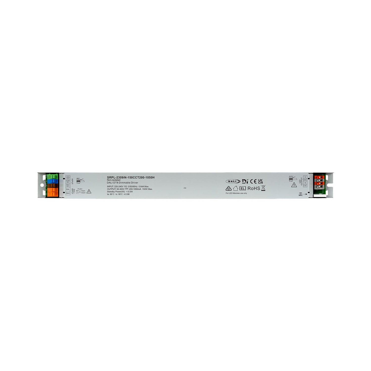 SRPL-2309iN-150CCT200-1050H is a D4i DT8 certified long metal casing 150W Non-SELV NFC dimmable LED driver. It is designed with 2 channel constant current output with adjustable current from 200mA to 1050mA, which enables it to be suitable for LED lights with different current. It is designed with 220-240VAC input. Power factor of the driver can be over 0.98 and efficiency is higher than 90%. It enables smooth and deep dimming to 0.1% without flickering and buzzing noise.