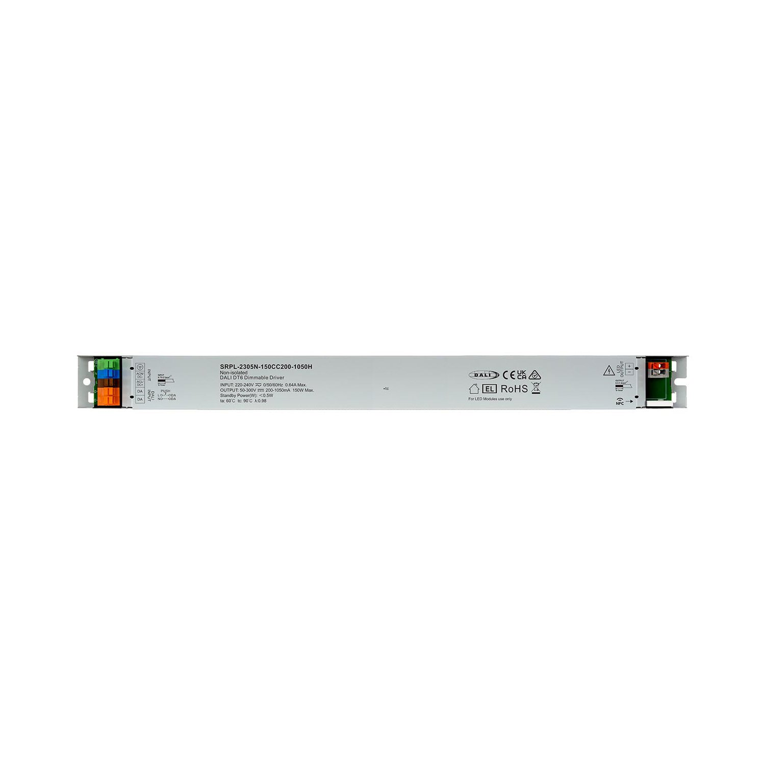 SRPL-2305N-150CC200-1050H is a DALI-2 certified long metal casing 80w Non-SELV NFC dimmable LED driver. It is designed with 1 channel constant current output with adjustable current from 200mA to 1050mA, which enables it to be suitable for LED lights with different current. It is designed with 220-240VAC input. Power factor of the driver can be over 0.98 and efficiency is higher than 90%. It enables smooth and deep dimming to 0.1% without flickering and buzzing noise. 1 DALI address for 1 channel output are assigned by DALI Master controller automatically, or by NFC Programming devices. Complying with IEC62386-101:2014, 102:2014, 207 ed.2, this DALI driver is compatible with DALI-2 certified application controllers and control devices.