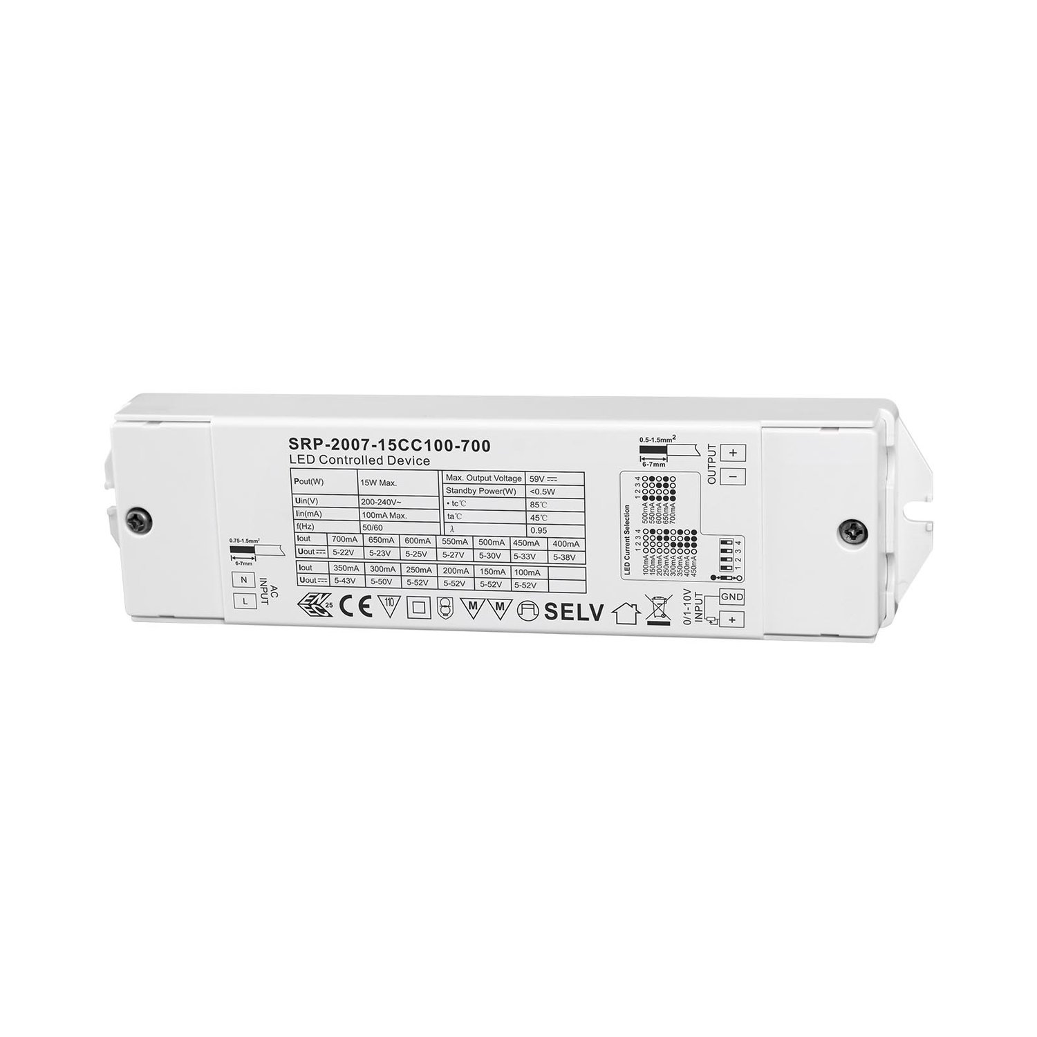 SRP-2007-15CC100-700 is a 15w 0/1-10V dimmable LED transformer with 1 channel constant current output and adjustable current from 100ma to 700ma by factory setting. It is designed with 200-240VAC input. Power factor of the driver can be over 0.9 and efficiency is higher than 80%. It enables smooth and deep dimming to 0.1% without flickering and buzzing noise. The dimmable transformer is controlled via 1-10v control unit and can be compatible with universal 1-10v signal. 0-10v version is optional.