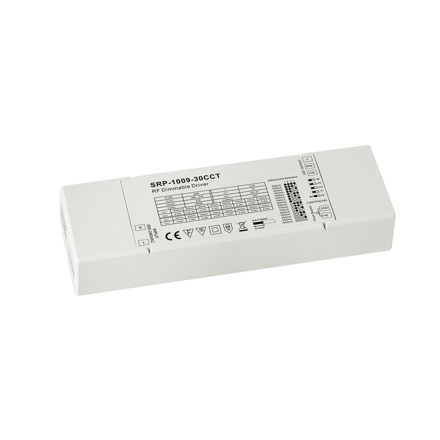 The 2 Channels 30W RF LED Driver (Constant Current) is a dimmable LED driver with RF control, offering a dimming range of 0.1%-100%. With a maximum output power of 30W, it features two channels providing 250-1000mA constant current output, with adjustable operation current set via dips. This driver is equipped with a class II power supply and a fully isolated plastic case, ensuring high power factor and efficiency. It is designed for controlling dual color LED lighting and is compatible with various RF remotes. With a radio frequency range of 868/869.5/916.5/434 MHz, it is suitable for indoor LED lighting applications.
