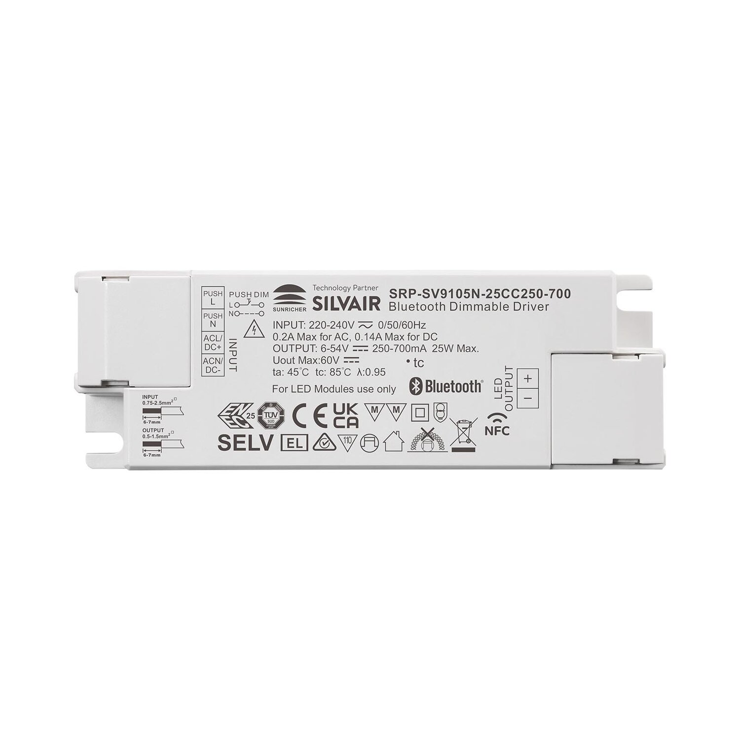 SRP-SV9105N-25CC250-700 is a plastic casing 25W Bluetooth NFC programmable LED driver, enabled by Silvair technology. It is designed with 1 channel constant current output with adjustable current from 250mA to 700mA, which enables it to be suitable for LED lights with different current. It is designed with 220-240VAC input. Power factor of the driver can be over 0.95 and efficiency is higher than 75%. It enables smooth and deep dimming to 0.01% without flickering and buzzing noise.