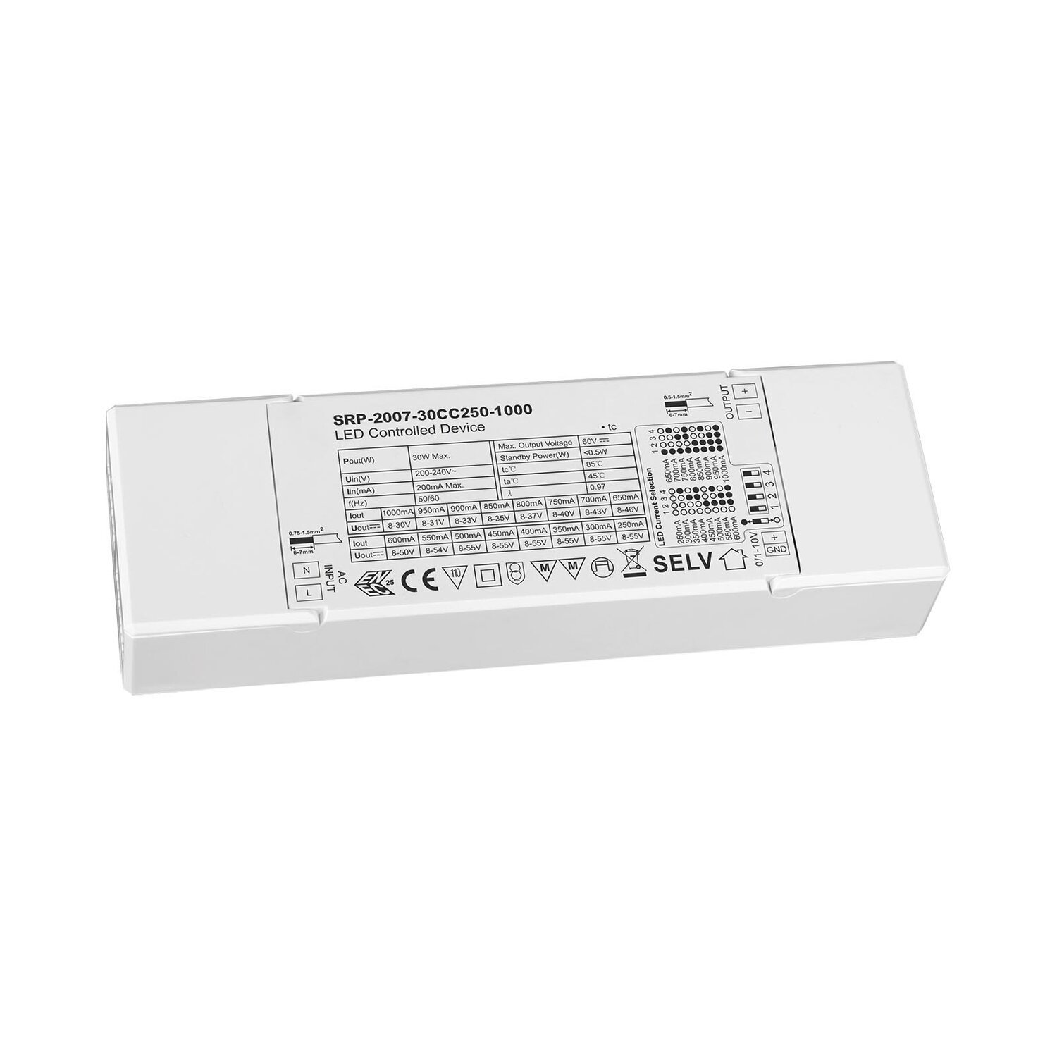 SRP-2007-30CC250-1000 is a 30w dimmable 0/1-10V LED light transformer with 1 channel constant current output and adjustable current from 250ma to 1000ma by DIP switches on the driver, which enables it to be suitable for LED lights with different current. It is designed with 200-240VAC input. Power factor of the driver can be over 0.9 and efficiency is higher than 83%. It enables smooth and deep dimming to 0.1% without flickering and buzzing noise. The dimmable driver is controlled via 1-10v control unit and can be compatible with universal 1-10v signal. 0-10v version is optional.
