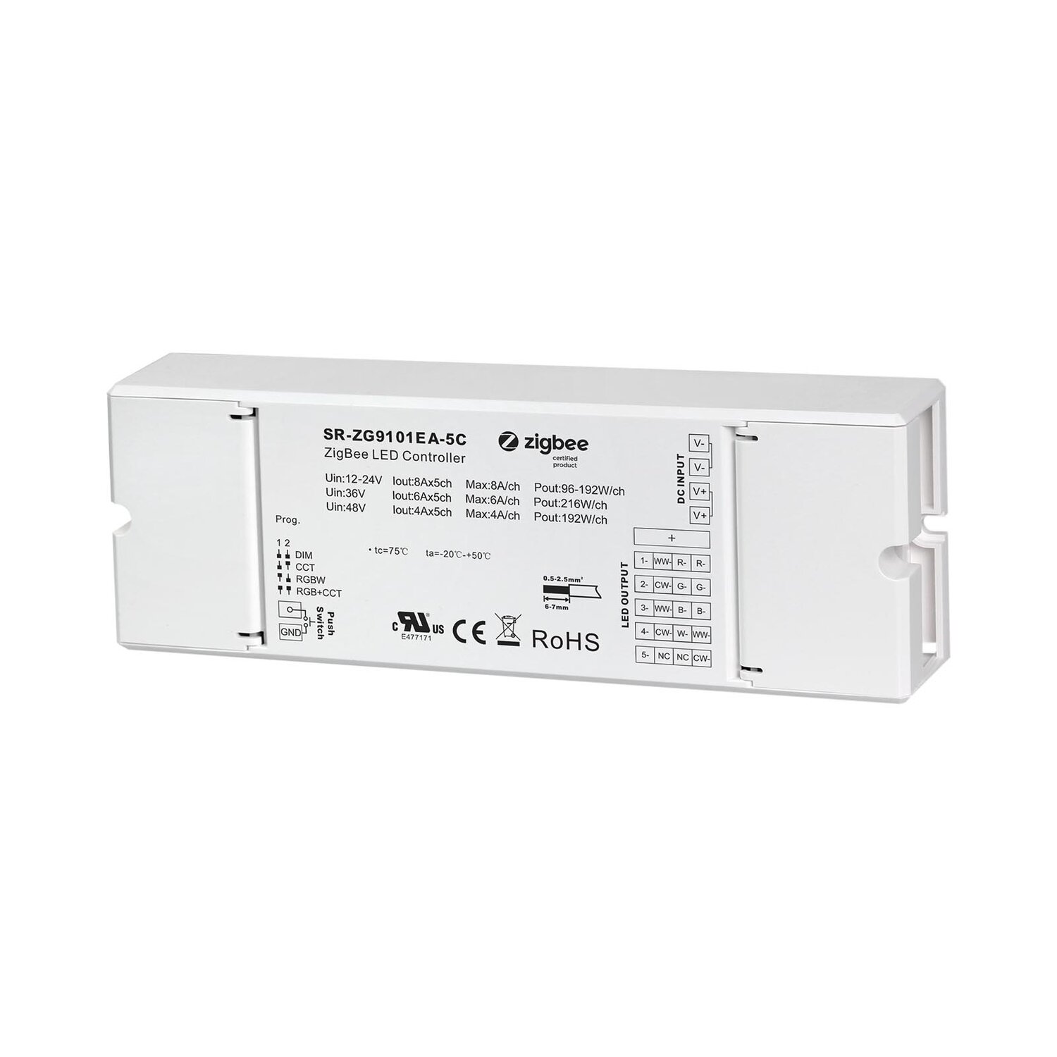 The 4 in 1 Universal Zigbee LED Controller is a Zigbee 3.0-based device that supports four selectable modes—DIM, CCT, RGBW, and RGB+CCT—configured via a dial switch, enabling control of on/off, brightness, color temperature, and RGB color of connected LED lights. It supports direct pairing with compatible Zigbee remotes via Touchlink, allows self-forming Zigbee networks without a coordinator, and offers find and bind mode for remote binding. The controller is compatible with universal Zigbee gateways, remotes, and supports up to 20 Zigbee Green Power switches.