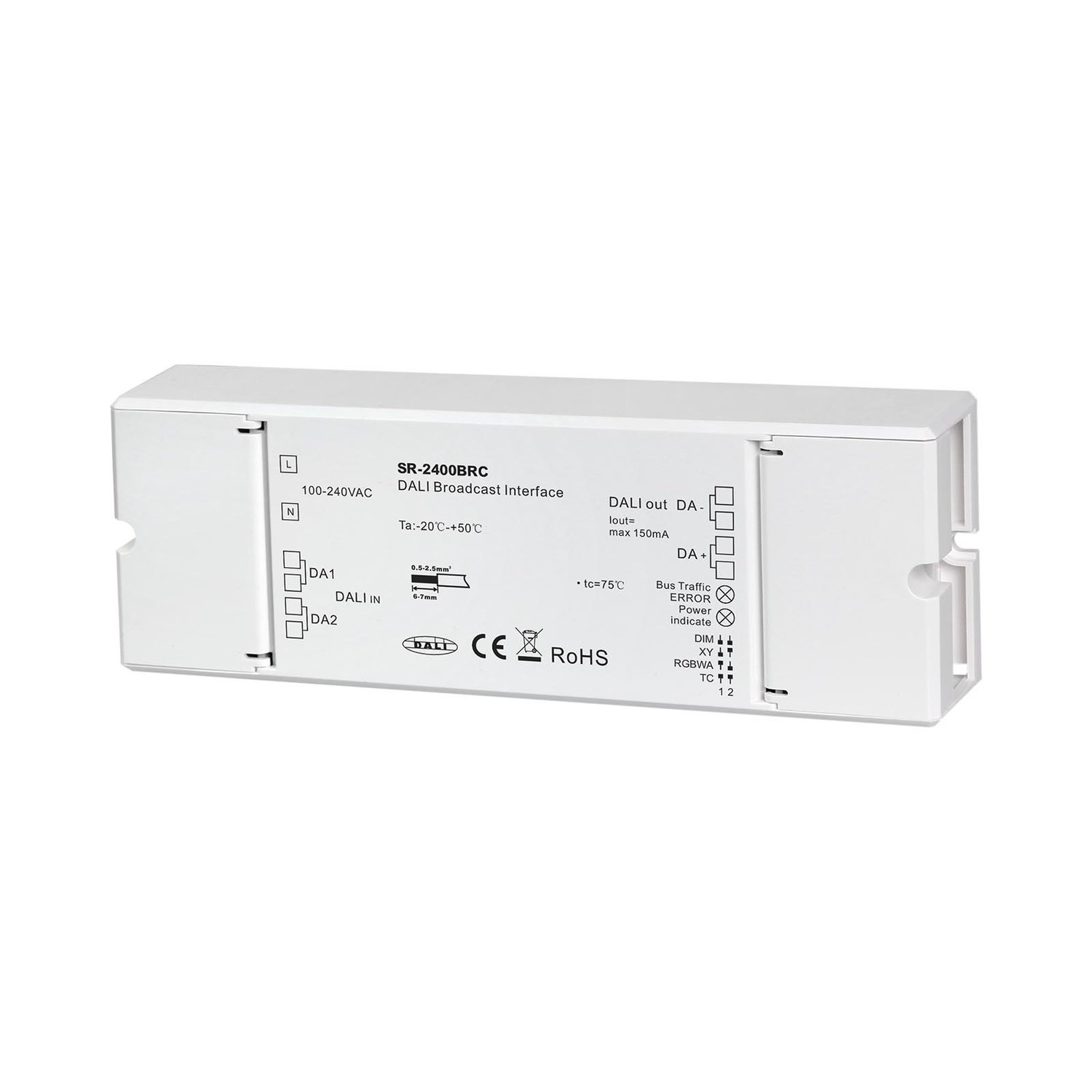 SR-2400BRC is a DALI broadcast module for DT6 and DT8 DALI system, which can be used to expand DALI circuit. This module receives DT6 and DT8 commands from DALI main circuit as a control gear with a single address, and forwards received DALI commands to all control gears connected to its DALI OUT. All control gears connected to DALI OUT will be controlled by the forwarded broadcast DALI commands. All control gears connected to DALI OUT will be controlled via the DALI address of the module. It is designed with DALI power supply output (150mA) to power max. 64 control gears. No DALI addressing required for the control gears connected to DALI OUT. The broadcast module greatly reduces time and cost of commissioning and simplifies maintenance. Multiple modules can be connected to DALI main circuit to establish multiple DALI sub-circuits to extend the number of DALI control gears in the DALI main circuit drastically.