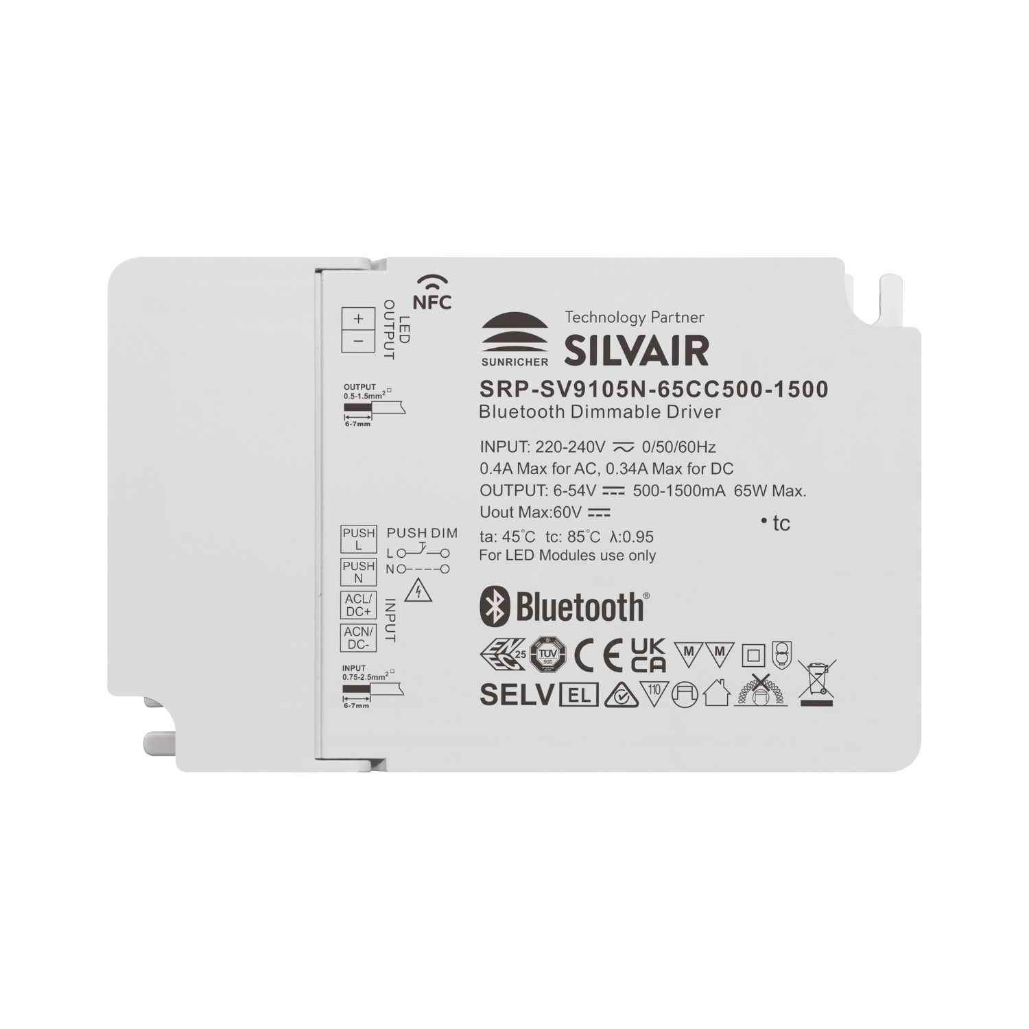 SRP-SV9105N-65CC500-1500 is a plastic casing 65W Bluetooth NFC programmable LED driver, enabled by Silvair technology. It is designed with 1 channel constant current output with adjustable current from 500mA to 1500mA, which enables it to be suitable for LED lights with different current. It is designed with 220-240VAC input. Power factor of the driver can be over 0.95 and efficiency is higher than 75%. It enables smooth and deep dimming to 0.01% without flickering and buzzing noise.