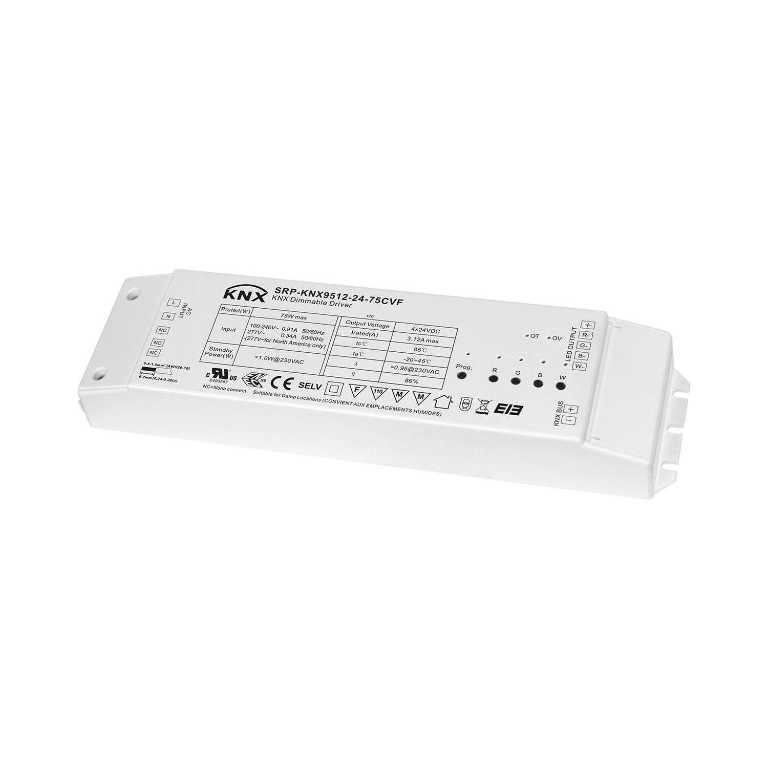 The 75W KNX LED Driver is a dimmable constant voltage driver with a dimming range of 0.1% to 100%, supporting 100-277VAC input voltage and providing a maximum output power of 75W across 4 channels of 24V constant voltage output, featuring a Class II fully isolated plastic case, high power factor and efficiency, built-in KNX interface with KNX/EIB bus connection terminal, support for physical and group addressing, control of single color LED lighting with relative and absolute dimming, scene control, and on/off switching, and is compatible with commissioning and project design using ETS4.