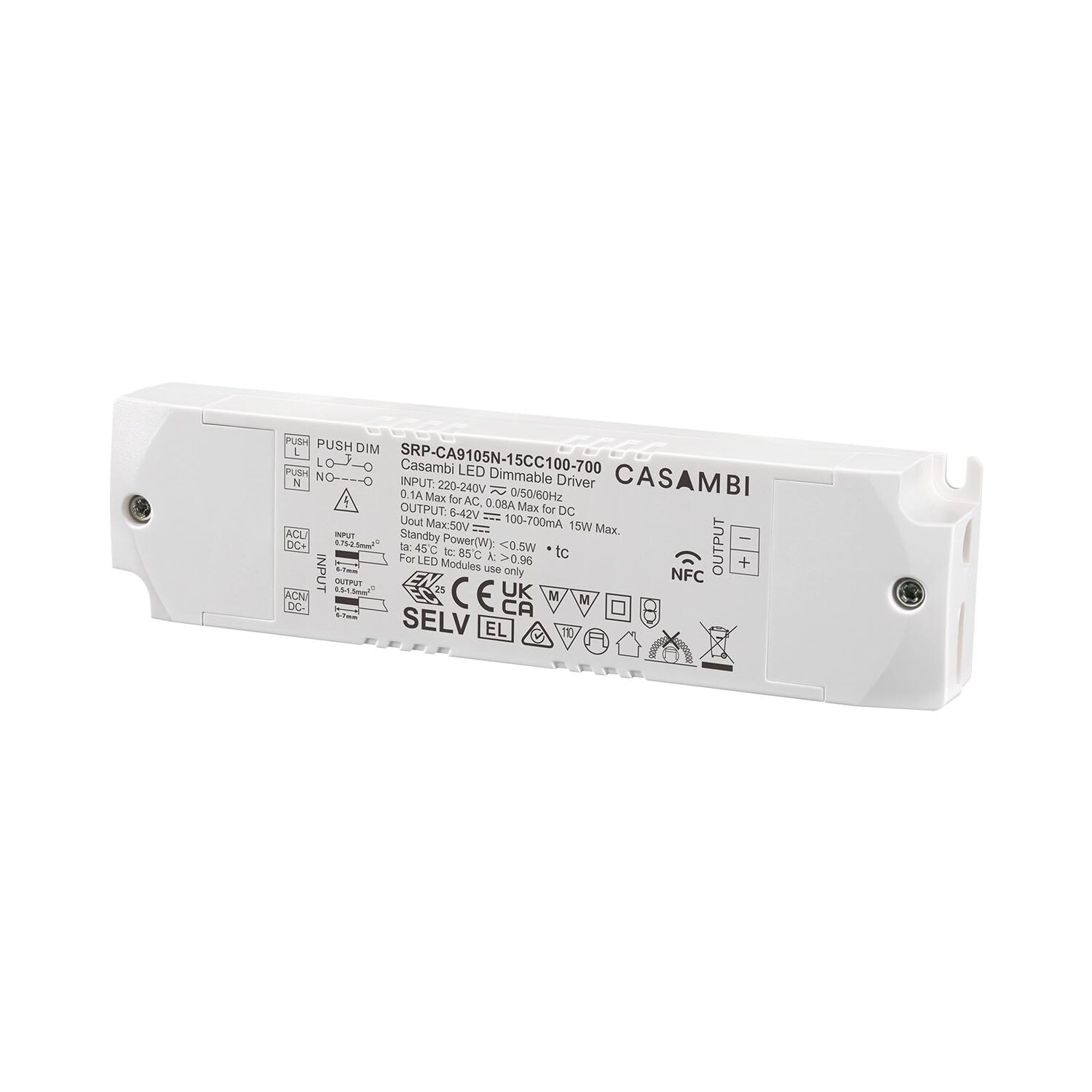 SRP-CA9105N-15CC100-700 is a plastic casing 15W Bluetooth NFC programmable LED driver, enabled by Casambi technology. It is designed with 1 channel constant current output with adjustable current from 100mA to 700mA, which enables it to be suitable for LED lights with different current. It is designed with 220-240VAC input with high Power Factor and Efficiency. It enables smooth and deep dimming to 0.01% without flickering and buzzing noise.