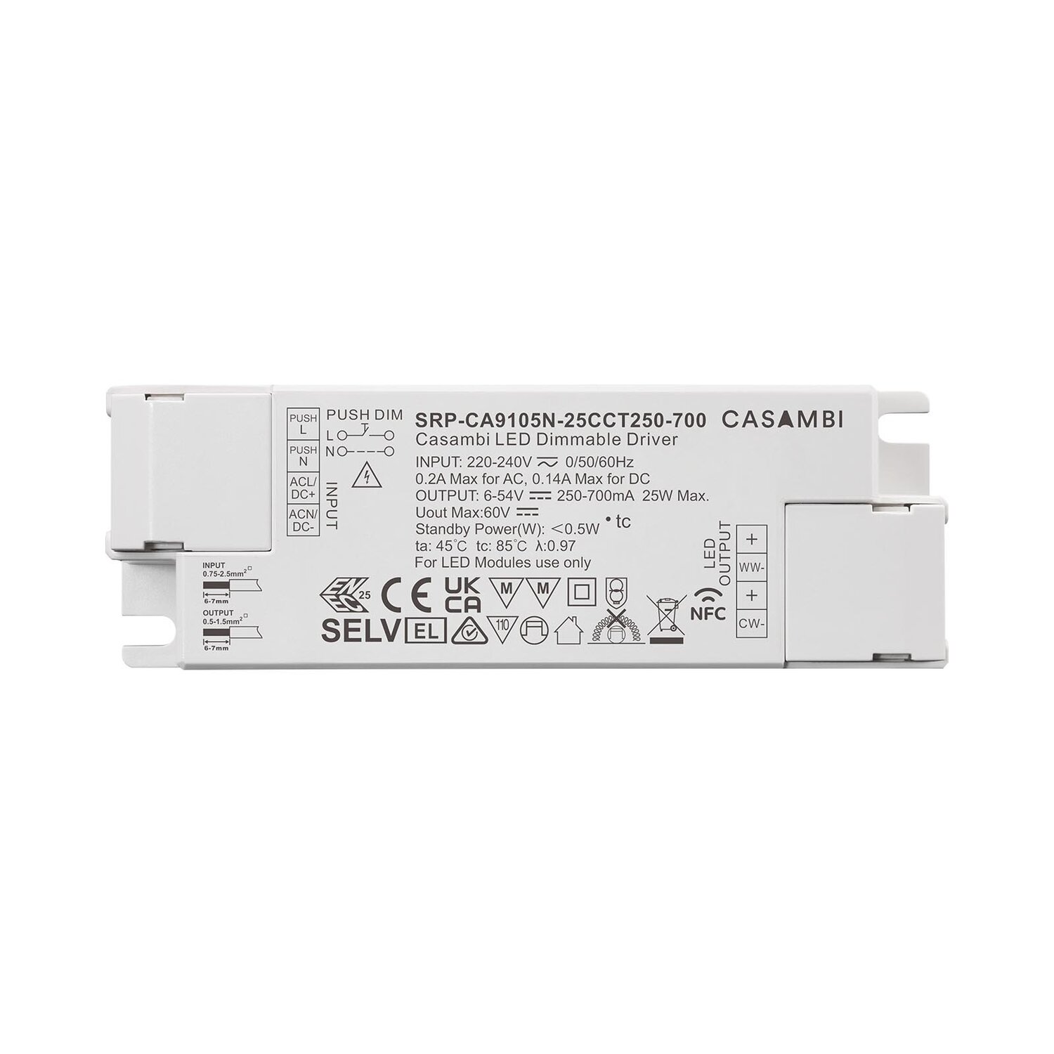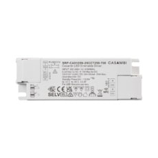SRP-CA9105N-25CCT250-700 is a plastic casing 25W Bluetooth NFC programmable LED driver, enabled by Casambi technology. It is designed with 2 channels constant current output with adjustable current from 250mA to 700mA, which enables it to be suitable for LED lights with different current. It is designed with 220-240VAC input with high Power factor and efficiency. It enables smooth and deep dimming to 0.01% without flickering and buzzing noise.