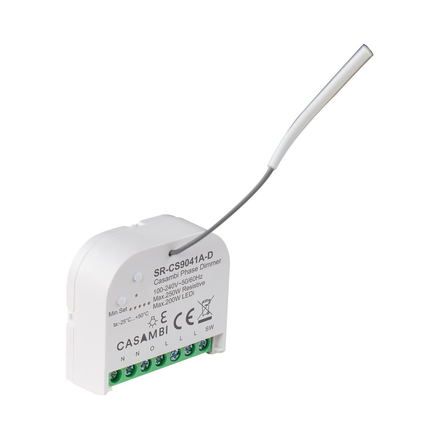 The Casambi Micro Smart Dimmer can operate with either a two-wire connection without a neutral lead or a three-wire connection with a neutral lead. It features advanced microprocessor control and an algorithm for smart light source detection, along with active power and energy metering functionality. The dimmer includes a soft start function and a minimum dimming level setting function, and is compatible with various types of switches, including momentary, toggle, and three-way. The active element is a semiconductor electronic switch, and the device is designed to be installed in wall switch boxes that meet the applicable installation requirements. The Bypass is an extension unit that supports conventional incandescent, HV halogen light sources, ELV halogen lamps, dimmable LED bulbs (with electronic transformers), MLV halogen lamps (with ferromagnetic transformers), and dimmable compact fluorescent CFL tube lamps, as well as supported dimmable light sources with a power factor greater than 0.5 and a minimum power of 3VA when using the Bypass.