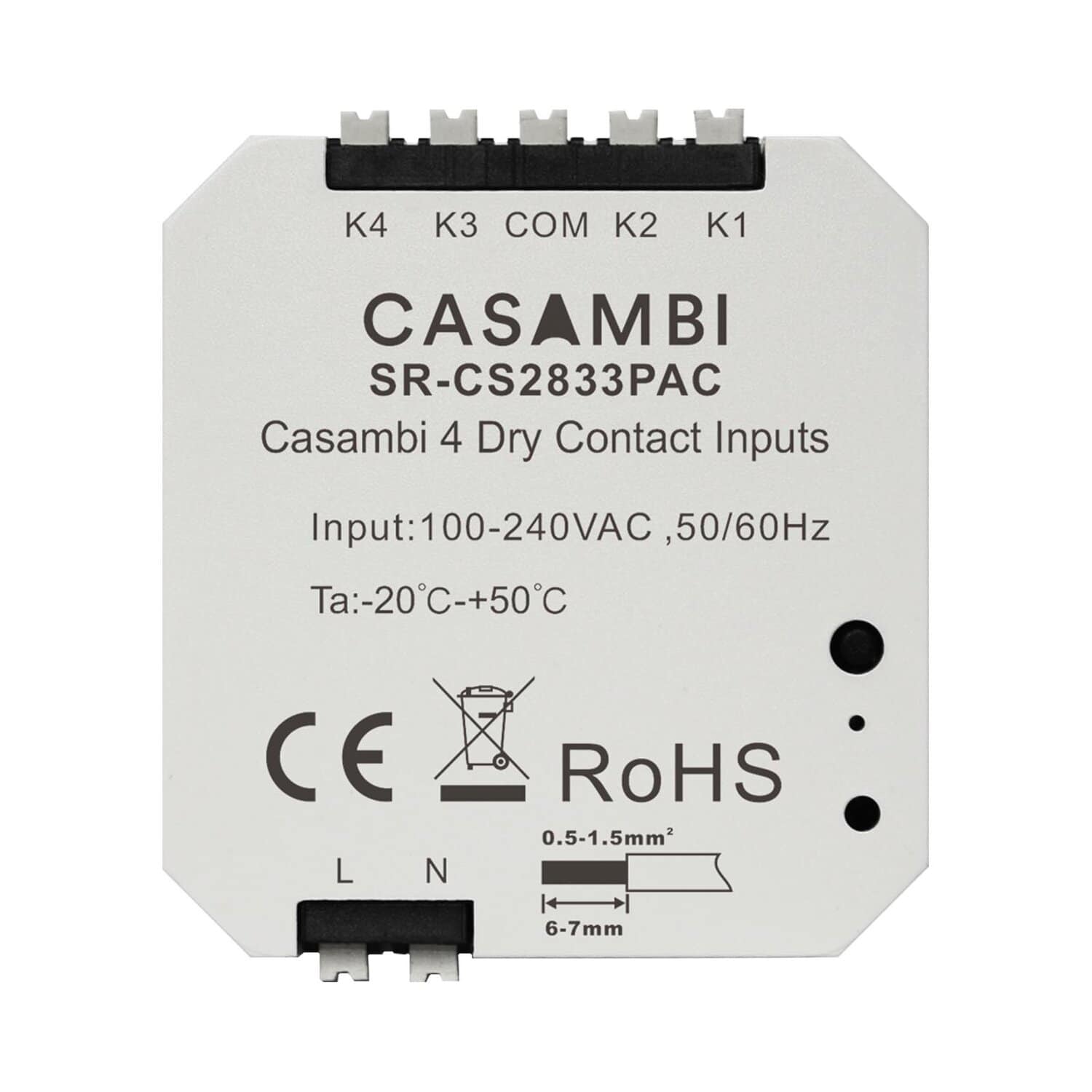 The Casambi push button coupler features 4 dry contact inputs for connecting up to 4 standard push buttons, enabling flexible wireless control via a Bluetooth mesh network with a typical indoor range of up to 50 meters. Button functions can be freely configured in the Casambi app to control individual luminaires, groups, scenes, or the entire network. Housed in an IP20-rated enclosure, the device is reliable and backed by a 5-year warranty.