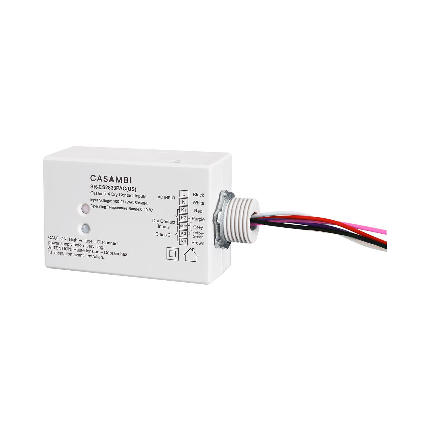 The Casambi Push Button Coupler features 4 dry contacts, allowing connection to 4 push buttons. It operates within a mesh network, extending the control distance by transmitting received signals to neighboring devices, with a typical wireless range of around 50 meters in indoor environments.