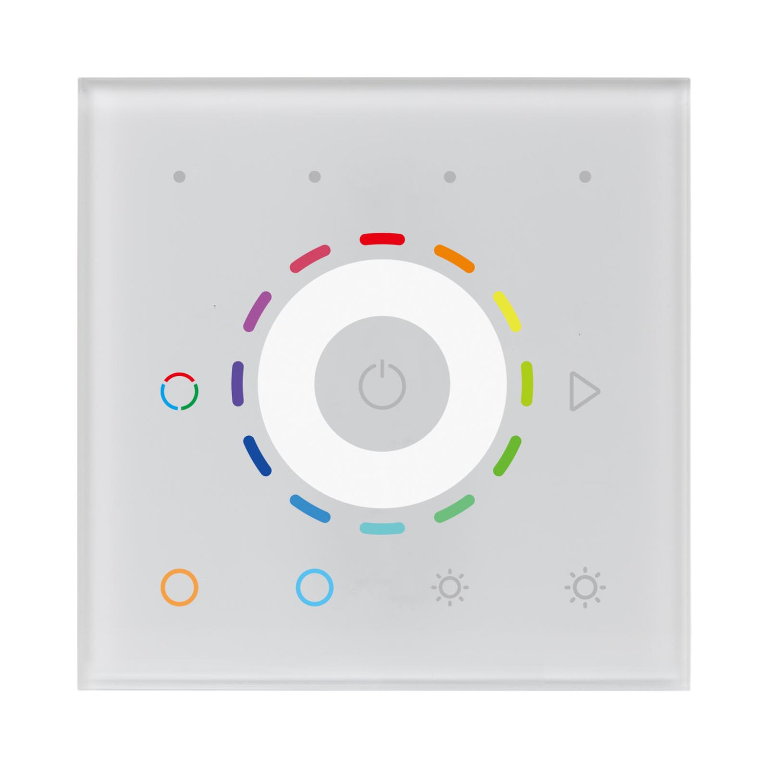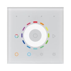 The Casambi RGBCCT Touch Panel features a touch-sensitive, glass interface designed for seamless integration with the Casambi mesh network, enabling control over RGBCCT colors. The button functions can be configured through the Casambi app, offering flexibility in operation.