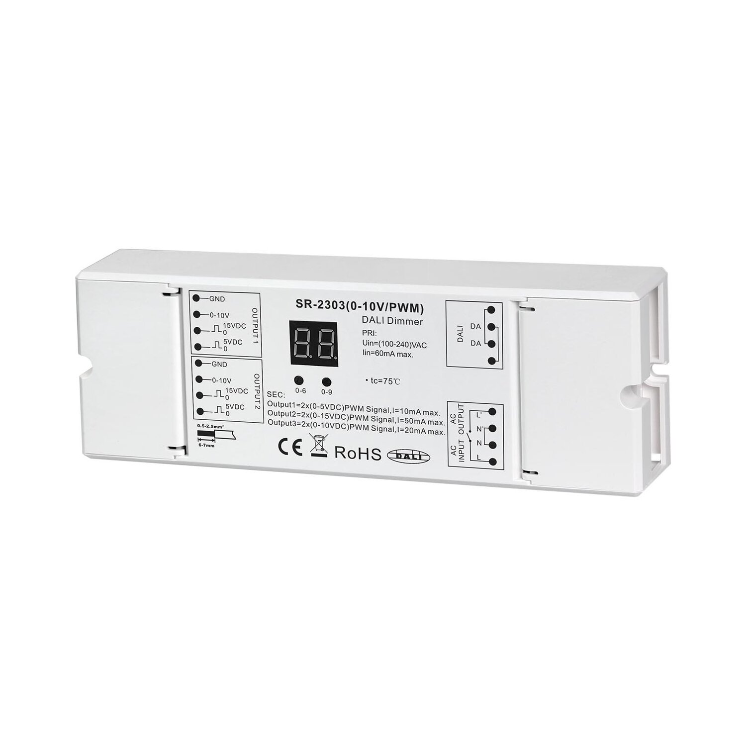 The SR-2303 (0-10V/PWM) is a 0-10V LED driver which receives and converts DALI signal to 0-10V/PWM signal to dim and switch single color LED lighting. The DALI address can be manually assigned and shown on the numeric digital display or automatically assigned by master controllers. The 0-10V driver can be compatible with a variety of DALI masters.