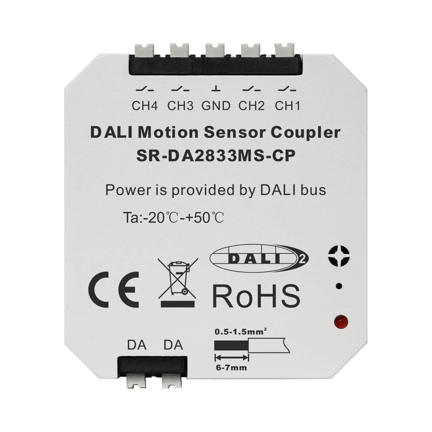 The DALI Motion Sensor coupler SR-DA2833MS-CP is DALI-2 certified DALI-2 control device with 4 channels dry contact input for normal motion sensors according to IEC62386-101, IEC62386-103 and IEC62386-301.
