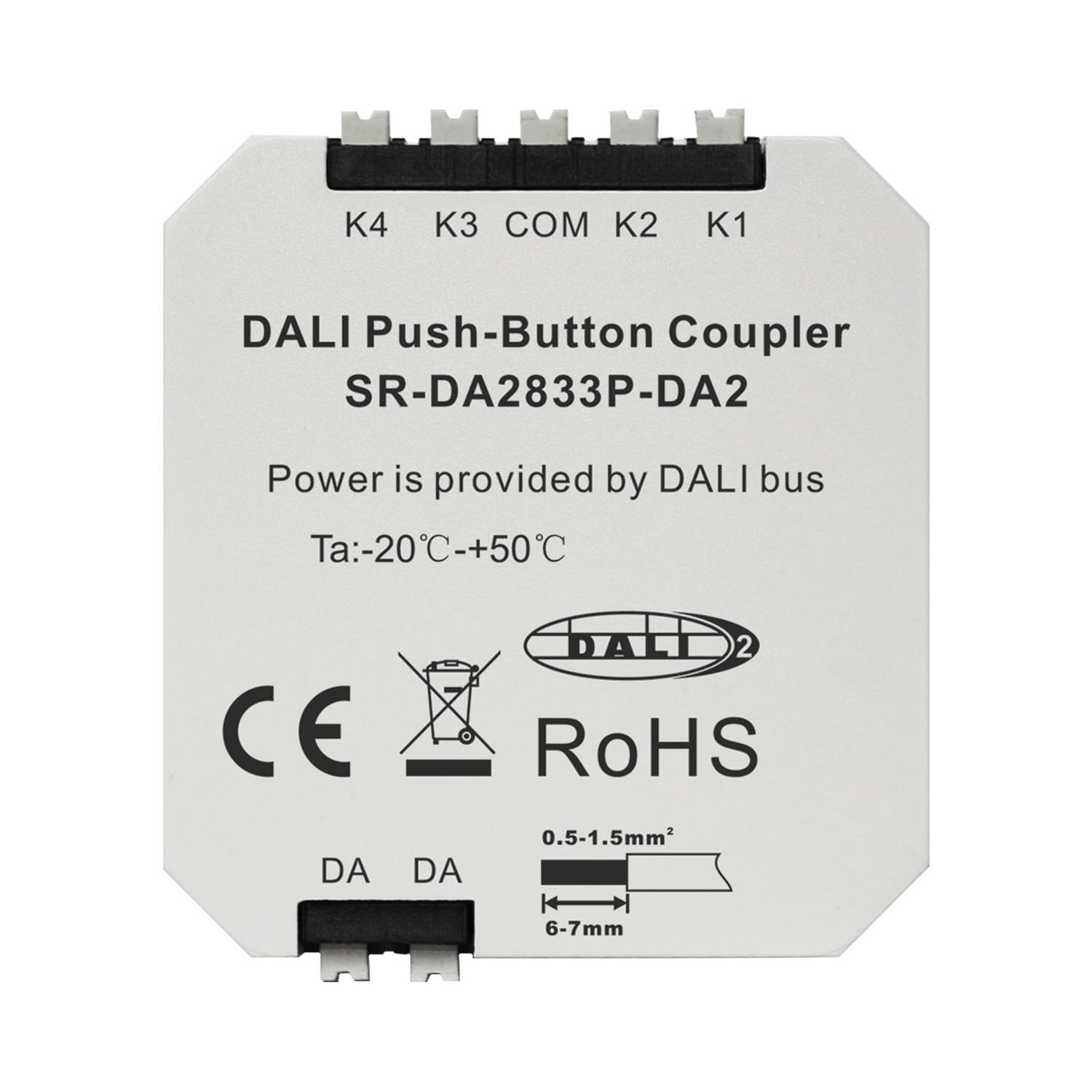 The DALI push button coupler SR-DA2833P-DA2 is industry first DALI-2 certified DALI-2 control device with 4 push buttons according to IEC62386-101, IEC62386-103 and IEC62386-301. This coupler enables to integrate existing push button switches into DALI circuit and convert the switches into DALI input device. The coupler supports 4 push button instances. It is suitable for integration and in combination with DALI-2 compliant central control units. The push button device is multimaster capable, multiple modules can be installed on the DALI- line. The DALI-2 input device is DALI bus powered, no extra power supply required. It is easily configurable via DALI-2 compliant central controller USB interface. This DALI push button coupler can be easily installed into existing 55mm wall boxes behind existing push button switches.