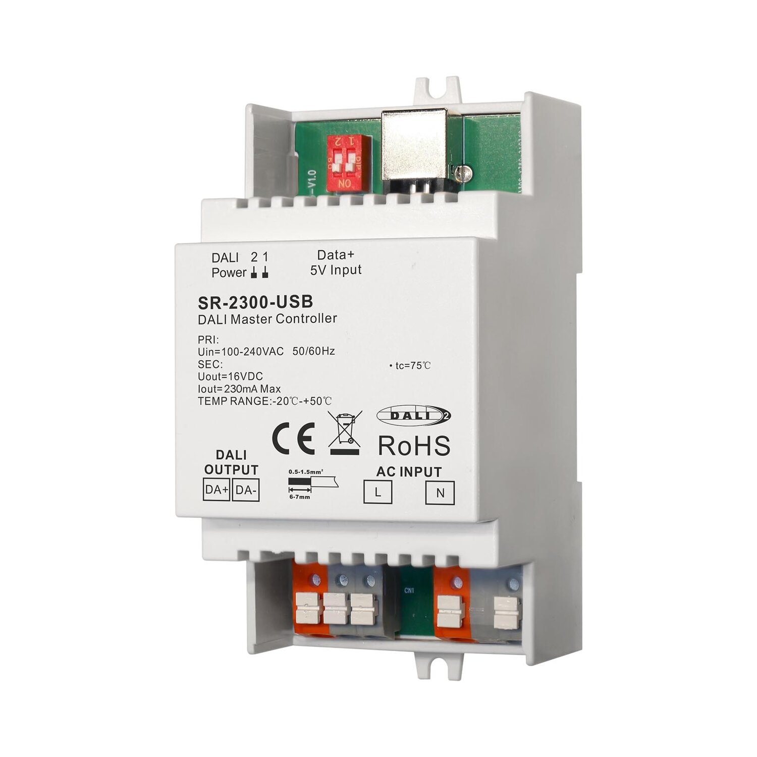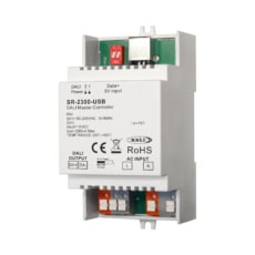 The DIN Rail DALI master controller SR-2300-USB is a central controller of a DALI system to control DALI control gears and configure DALI-2 input devices on the DALI line. Each DALI channel enables to automatically assign and manage addresses to up to 64 control gears, the control gears can be assigned to up to 16 groups. The DALI-2 master supports 5 DALI control gear device types: DT6, DT8 Tc, DT8 XY coordinate, DT8 RGBWA, DT7 Switching actuator. Each DALI channel also supports all types of DALI-2 input devices include push buttons, motion sensors, light sensor, rotary switch and touch panels. Each DALI channel can address and manage up to 64 DALI-2 input devices, the input devices can be assigned to up to 32 groups. Each DALI channel enables to set up to 16 DALI scenes. It enables to set up to 256 timer tasks. It enables to set up to 4 types brightness fade and color fade cycle schedules. It enables to set up to 4 Bionic color temperature schedules for the CCT control gears to mimic natural light change during 24 hours of a day (Human Centric Lighting). It is designed with PC configuration software tool, enables to configure and read parameters of the DALI control panel and control gears, and manage the control panel and control gears. This DALI master is designed with built-in 230mA DALI PS to power the DALI circuit. Meanwhile dip switches can be used to disable or enable built-in DALI PS. Once built-in DALI PS is disabled, the master controller can be connected to an external DALI PS. The DALI master can be easily mounted on 35mm standard DIN rail.