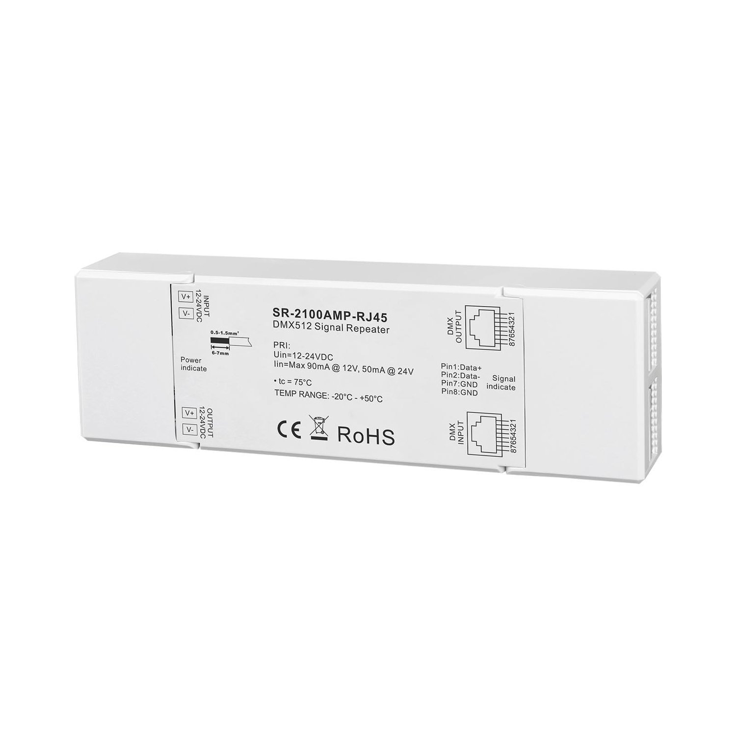 SR-2100AMP-RJ45 is a DMX512 signal amplifier which complies with standard protocol DMX512 (1990). With DMX signal input and DMX signal output, the signal amplifier works with DMX decoder series to expand DMX signal based on the actual lighting projects.